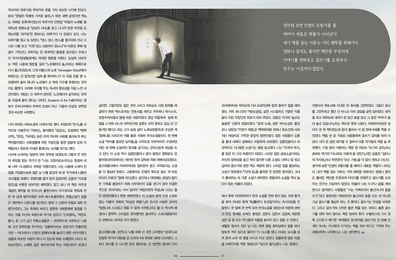 생각해 보면 인생의 모퉁이를 돌 때마다 새로운 책들이 나타났다. 내가 책을 읽는 이유는 거의 쾌락을 위해서다. 영화나 음악도 좋지만 책만큼 꾸준하게 이야기를 전해주고 글쓰기를 도와주는 친구는 지금까지 없었다. 아울러 나는 누구나 글을 써야 한다고 생각한다. 사람들은 "너는 카피라이터 출신이니까 글을 쓰지."라고 말하지만 카피라이터 출신이라 글을 쓰는 게 아니라 그냥 글쓰기를 열심히 하는 것뿐이다. 글쓰기는 인생을 바꿔준다. 그리고 글쓰기의 시작은 좋은 책을 읽는 것이다. 물론 글쓰기를 전혀 하지 않아도 책은 읽어야 한다. 누벨바그의 기수 장 뤽 고다르가 얘기한 ‘씨네필의 3단계’처럼 글쓰기의 첫 번째 단계인 독서는 자신에게 다가오는 책을 귀히 여기고 기억해 주는 것에서부터 시작된다고, 나는 생각한다.
