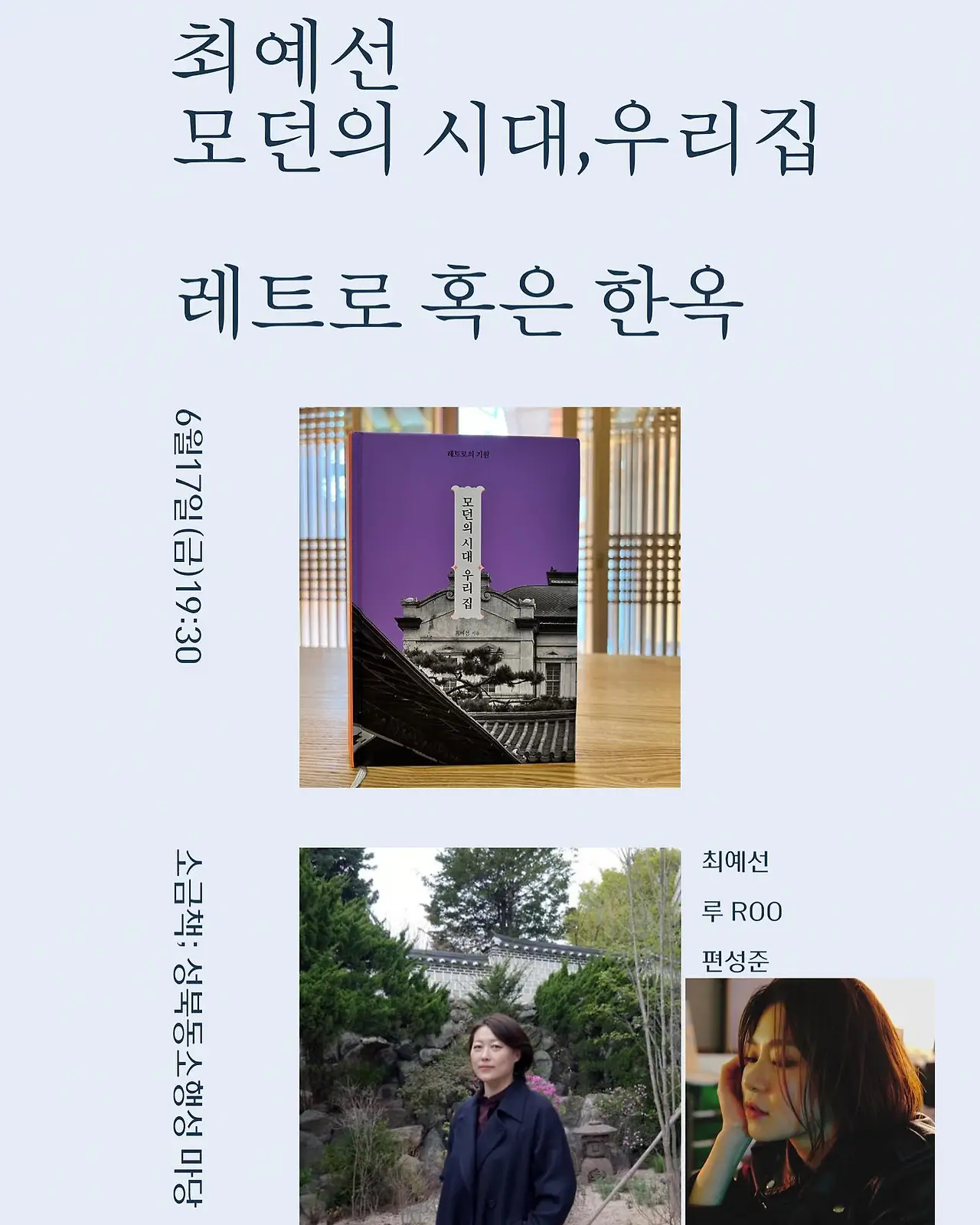 '소금책'은 소행성에서 금요일 저녁에 열리는 책에 관한 수다 타임입니다. 저희가 좋아하는 작가님이 한옥 마당에 오셔서 직접 독자들과 만나는 모습을 보고 싶어서 아내와 제가 함께 행사를 기획했습니다. 6월 17일 저녁 7시 30분에 열리는 첫 소금책은 최예선 작가를 모시고 그의 신작 『모던의 시대 우리 집』이라는 책에 얽힌 이야기를 합니다. 제가 모더레이터로 등장하고 최예선 작가 외에 가수 루(Roo)의 깜짝 공연도 준비되어 있습니다. 루에게는 특별히 모던 시대에 어울리는 곡을 준비해 달라고 부탁을 해놨는데 어떤 곡을 들고 올지 저도 궁금합니다. 참가 인원은 스무 명 정원이 마감되었는데 신청서 작성 후 입금을 안 한 분들이 계셔서 몇 자리 추가 모집을 하게 되었습니다. 1920~30년대 집과 건축, 그리고 역사와 인문학 글쓰기에 관심 있는 분들의 참여 바랍니다. 다음 주 금요일에 소금책에서 뵈어요.