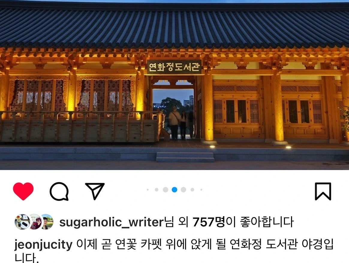오늘 전주에 있는 연화정도서관에 가서 '평범한 사람의 일상은 어떻게 책이 될 수 있었나?'라는 제목으로 강연을 하고 왔습니다. 전주시 관광거점도시 추진단 정명희 단장님의 초청으로 갔었는데, 이는 요즘 전주에서 8주에 걸쳐 여행과 인문학에 대한 강의를 진행하고 있는 박재희 선생의 추천이 있었기에 가능한 일이었습니다. 전북대학교 옆에 붙어 있는 연화정도서관은 얼마 전 문을 열었고 주변엔 연꽃이 가득 피어있는 아름다운 한옥 건물이었습니다. 전주시는 퇴임을 앞두고 있긴 하지만 시장님이 문화에 관심이 많은 분이라 그동안 강원국 선생이나 박웅현 ECD 같은 핫한 인사들이 내려와 강연을 했다고 합니다.