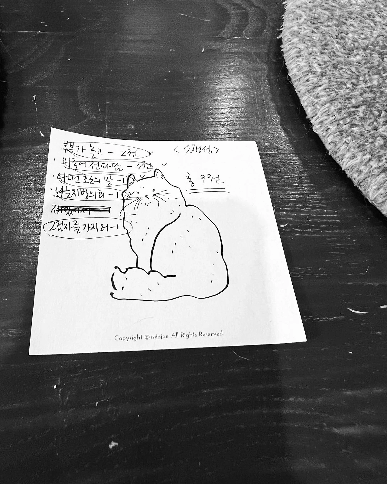 서점 책보냥의 김대영 작가와 아내, 그리고 나까지 셋이 오전에 만나 성북동에 새로 생긴 비빔밥집에서 밥을 먹고 서점으로 갔다. 고양이 하로와 하동이가 분주히 돌아다녔다. 아내는 청주 도서관에서 나와 함께 강연하는 10주짜리 프로그램 《내 인생의 화양연화 : 손바닥 자서전 쓰기》책 만드는 일로 김 작가와 이것저것 의논을 했다. 내가 카드지갑을 안 가져왔다고 소리를 질렀더니 김 작가가 "괜찮아요. 소행성은 장부가 있으니까" 라며 메모지를 보여주는데 그 와중에도 작가의 글씨와 그림이 너무 예쁘다. 목요일에 글쓰기 과외를 받고 계시는 선생님의 부탁으로 주문한 내 책 『부부가 둘 다 놀고 있습니다』 두 권과 금요일에 있을 ‘소금책’에 필요한 파우저 교수님의 『외국어 전파담』 세 권, 그리고 '소행성 책쓰기 워크숍' 수료생인 이일우 선생의 『나는 지방의회에서 일한다』와 최은숙 선생의 『어떤 호소의 말들』까지 받아 들었다. 문재인정부에서 연설비서관으로 일했던 신동호 시인의 신작 시집 『그림자를 가지러 가야 한다』는 아직 도착하지 않아서 그냥 왔다.