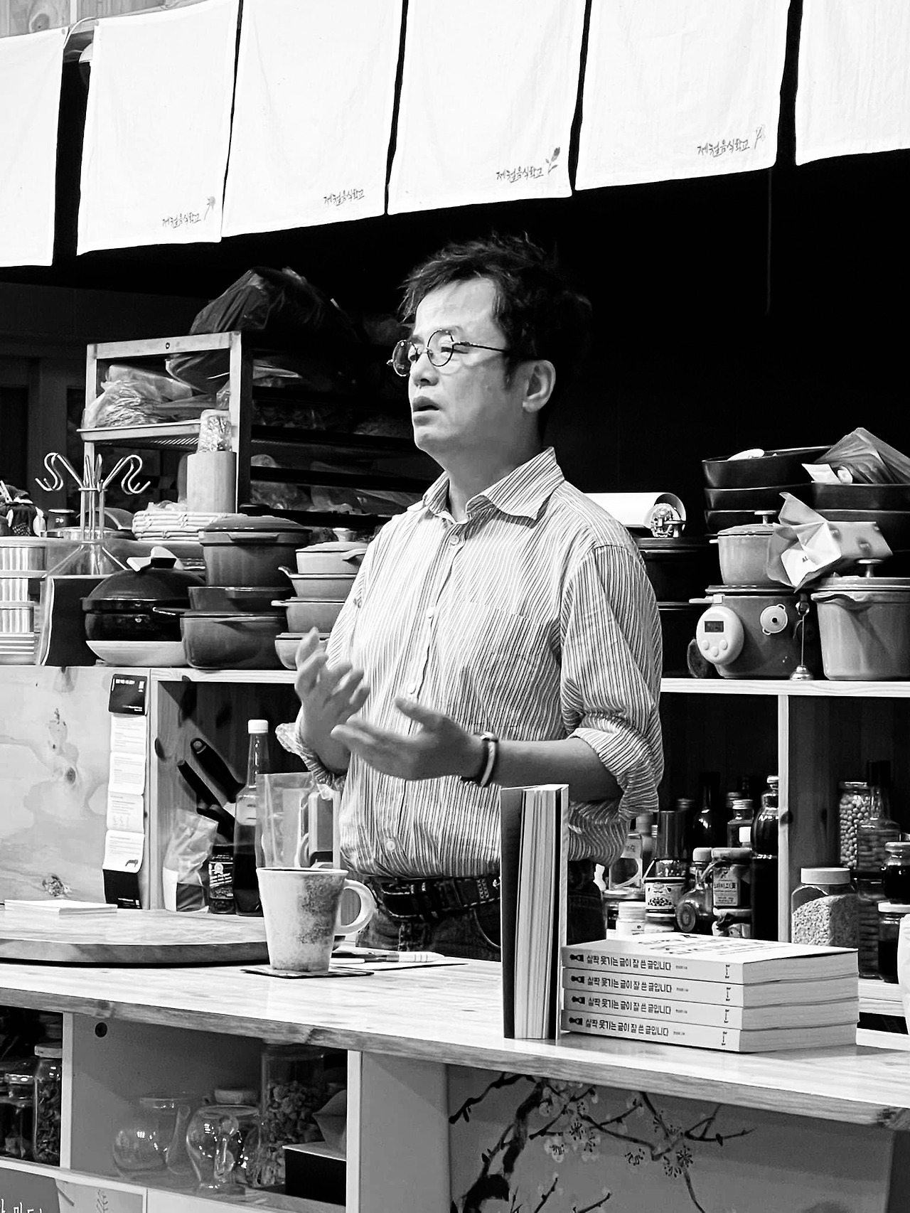 신기한 일이었습니다. 김지수 기자가 쓴 이어령 인터뷰집 『이어령의 마지막 수업』엔 죽음이라는 것이 별 게 아니고 저녁 늦도록 밖에서 뛰어놀고 있던 아이에게 엄마가 "밥 먹어라"라고 부르는 것이라고 했는데 고은정 선생의 책 『밥을 짓다 사람을 만나다』에서 엄마가 부르는 내 이름이 "밥 먹어라"의 다른 표현임을 알게 되었다는 구절이 나오니까요. 이처럼 밥은 한 사람의 삶을 북돋아주기도 하고 끝내기도 하는 근원적인 존재였습니다. 저는 고은정 선생의 글 중 바지락 때문에 죽음의 문턱에까지 갔었던 이야기에 주목했습니다. 그 글은 '냉이 바지락 밥 탄생 비화'일 뿐이라고 의뭉을 떨고 있지만 사실은 바지막 때문에 바다에 빠져 죽을 뻔했던 여섯 살 고은정과 한창 일 하느라 바쁘게 돌아다니다 도로 한복판에 차를 세워두고 잠들었다 죽을 뻔했던 중년의 고은정을 교차시킴으로써 식재료와 한 사람이 인생이 어떻게 어우러지는가를 보여주는 멋진 글이었습니다. 교육생들과 함께 앉아 제 해석을 들은 고은정 선생은 "제 책을 쓰기만 했지 읽어본 적은 없는데, 이제라도 읽어봐야겠어요."라고 농담을 하며 좋아했습니다.
