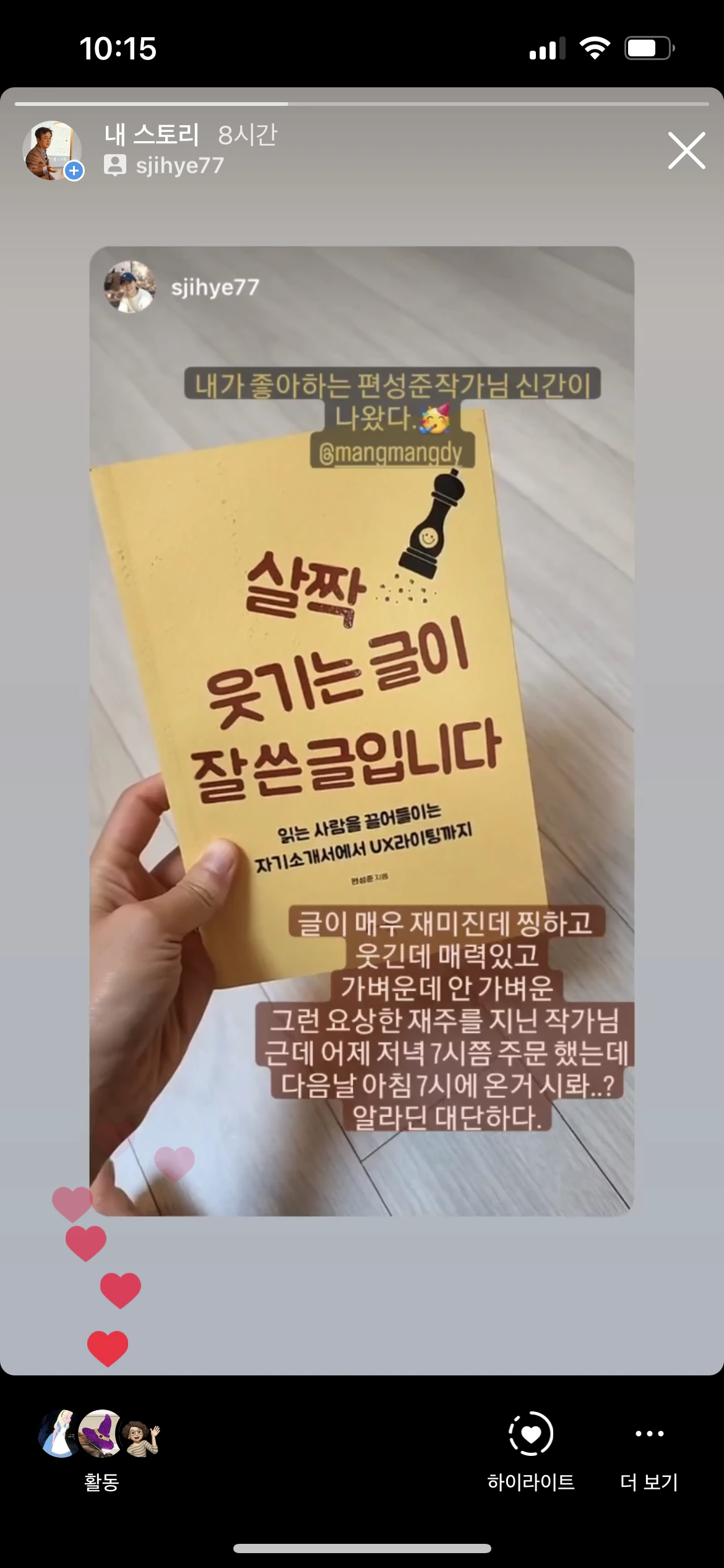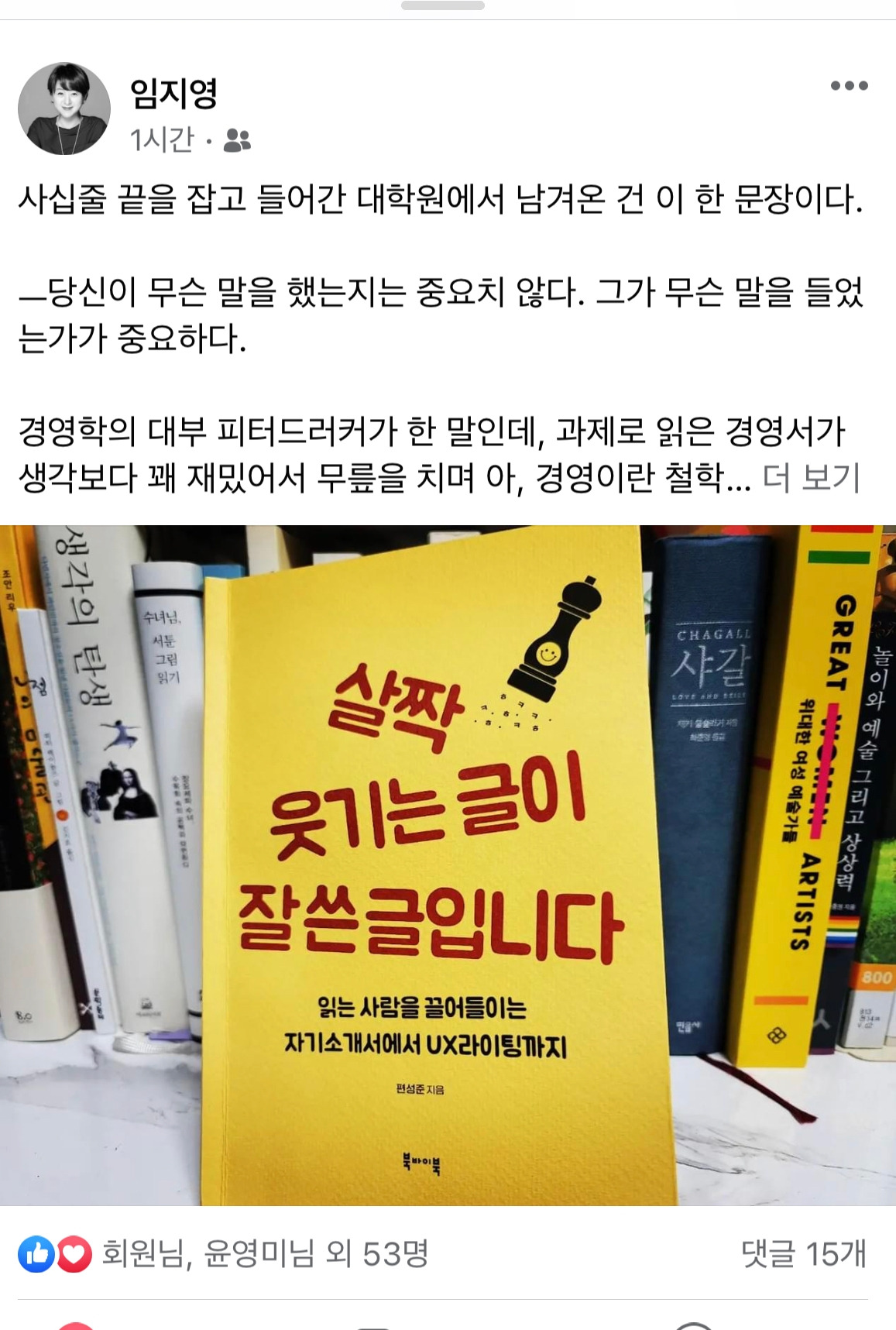 드디어 내 책 『살짝 웃기는 글이 잘 쓴 글입니다』에 대한 본격 리뷰가 올라왔다. 다름 아닌 임지영 작가님의 글이다. 작가님은 내 책을 읽고 '뼛속까지 내려가서 쓰라든지, 멱살 잡을 수 있는 것만 쓰라든지 하는 작법서가 대부분인데, 살짝 웃기게 쓰라는 책은 처음'이라면서 인생 찰방찰방 냇물 건너듯 살고 싶고, 글도 찰랑찰랑 넘치지 않게 쓰고 싶다는 속내를 밝힌다. 오, 나는 이런 리뷰를 기다렸다. 무조건 덕담을 하는 글이 아니라 내가 책에서 얘기한 걸 하나라도 공감하려는 진심의 글이 필요했다. 임지영 작가는 가벼움이든 절박함이든 내가 얘기하는 걸 의심하지 않고 다 받아들인다. 놀라운 독자다. 그리고 그걸 자신의 글쓰기에 녹여 본다. 그러다 보니 지금까지 아무도 찾아내지 못했던 117페이지의 '창의적이 --> 창의적인' 같은 오타를 발견하는 건 당연한 일이다. 소중한 지적, 고마울 따름이다. 2쇄부터 바로잡아야지. 이런 걸 찾아내는 리뷰야말로 '리스펙'이다. 고맙습니다, 임지영 작가님. 복 받으실 거예요.