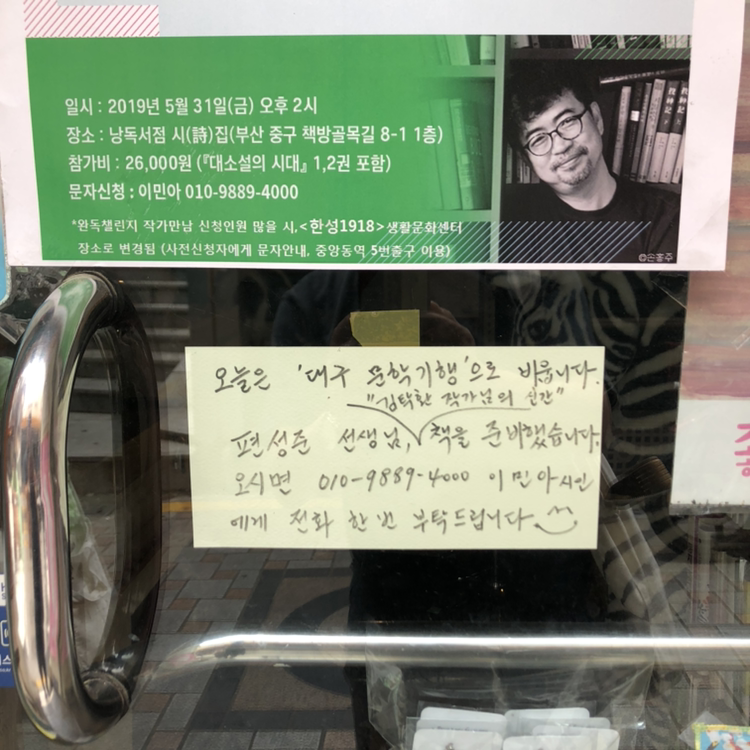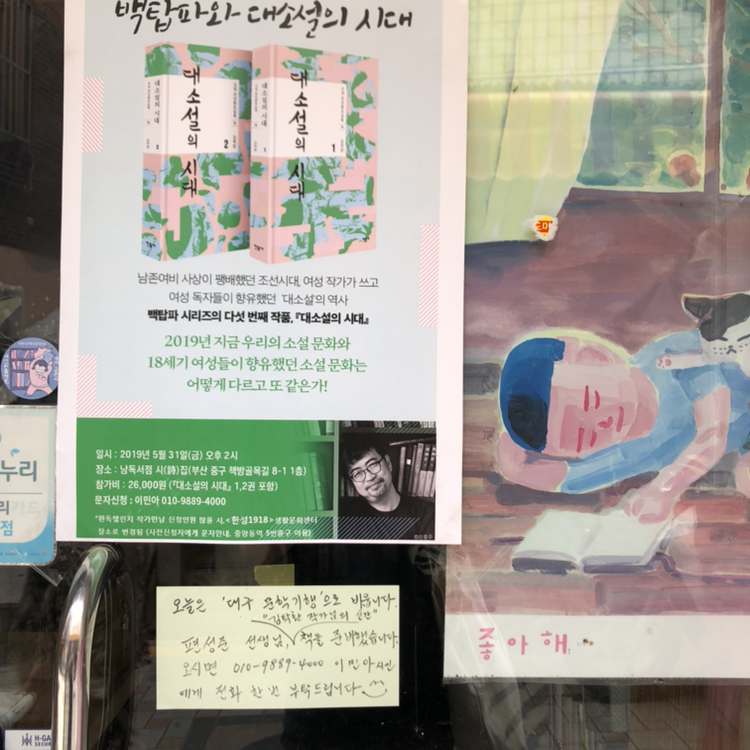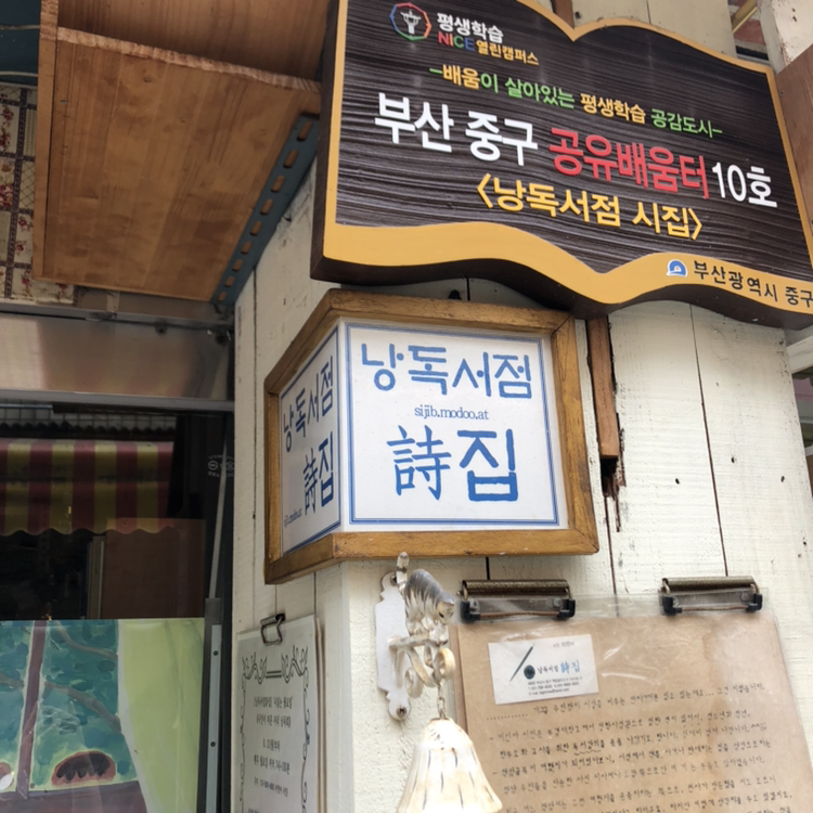 생각지도 못한 곳에서 내 이름을 발견했다. 보수동 책방골목을 어슬렁거리다가 "여보, 여기 당신 이름이 있어"라고 외치는 아내를 따라가 보니 거기가 바로 '낭독서점 詩집'이었다. 어제 김탁환 작가의 페이스북 포스팅 밑에 신작 [대소설의 시대]를 구하지 못해 부산에서 구해볼 생각이라고 댓글을 달았더니 보수동에서 책방을 운영하는 이민아 시인이 구해주겠다고 했던 것이었다. 그런데 오늘은 일요일이니 당연히 영업을 안 하겠지 생각하고 책방은 찾아볼 생각도 하지 않고 국제시장 안 '돌고래 순두부'에서 브런치를 잔뜩 먹은 뒤 부평동 깡통시장 안의 커피집 '깡통시장 바리스타'에서 발레를 전공했다는 한예종 출신의 바리스타 이승환 씨와 놀고 있었다. 그러다가 배도 부르고 하니 보수동 책방거리나 괜히 걸어가보자 하고 왔다가 이 서점을 발견하게 된 것이었다.