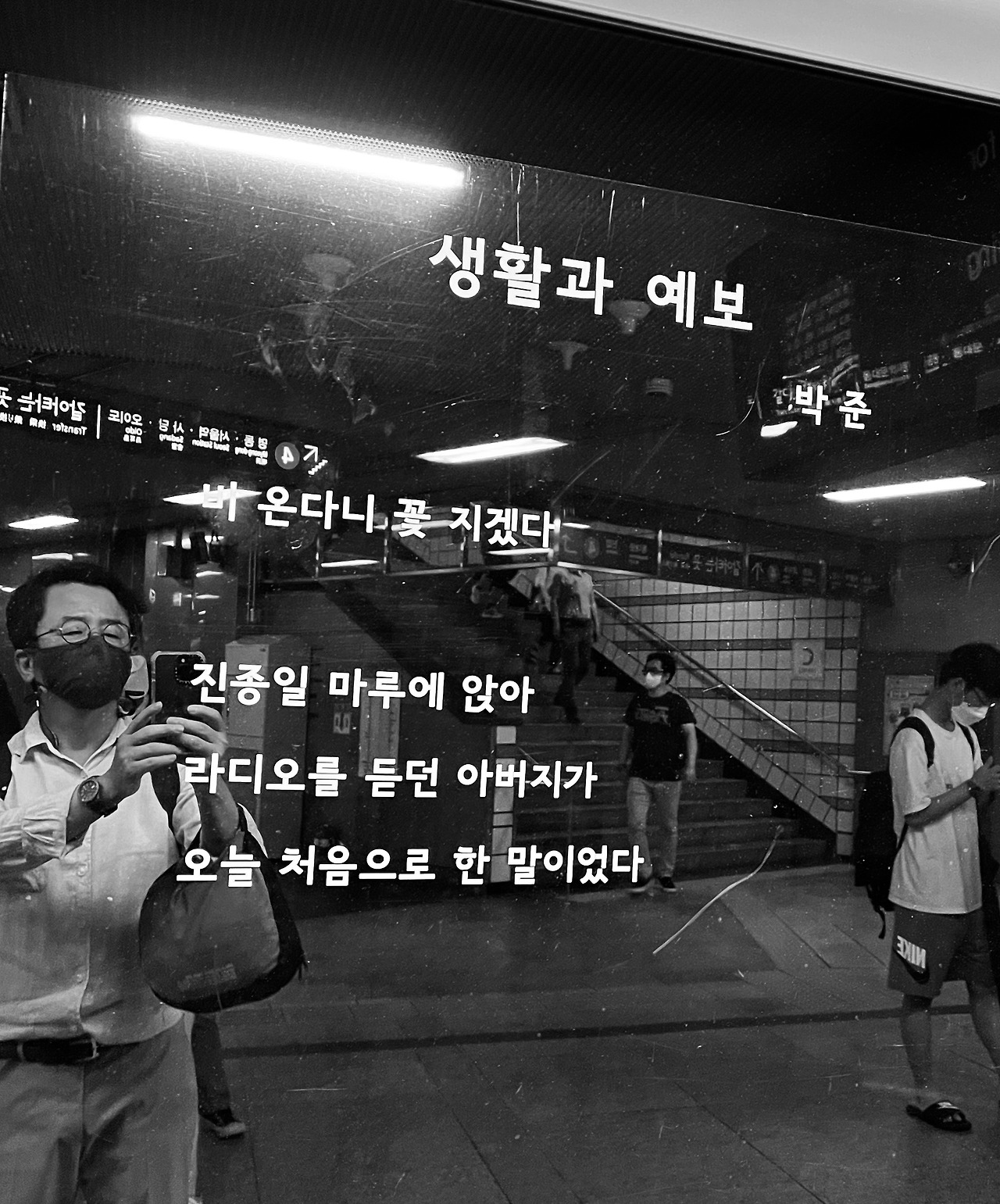 글쓰기 강연을 하러 고속버스터미널 가는 길에 충무로 전철역에서 마주친 박준 시인의 시. 박준의 아버지가 했다는 말을 쓰며 <생활과 예보>라는 무심한 제목을 붙였다. 지하철 가림막에 쓰인 시들은 거의 다 ‘저런 게 어떻게 뽑혔을까’궁금하기만 했던 시민공모작이었는데 가끔은 이렇게 좋은 시도 있다. 박준처럼 단단하고 착한 시인의 소품을 만난 것은 작은 행운이다. 오늘내일 강연이 좋은 기억으로 남을 모양이다.