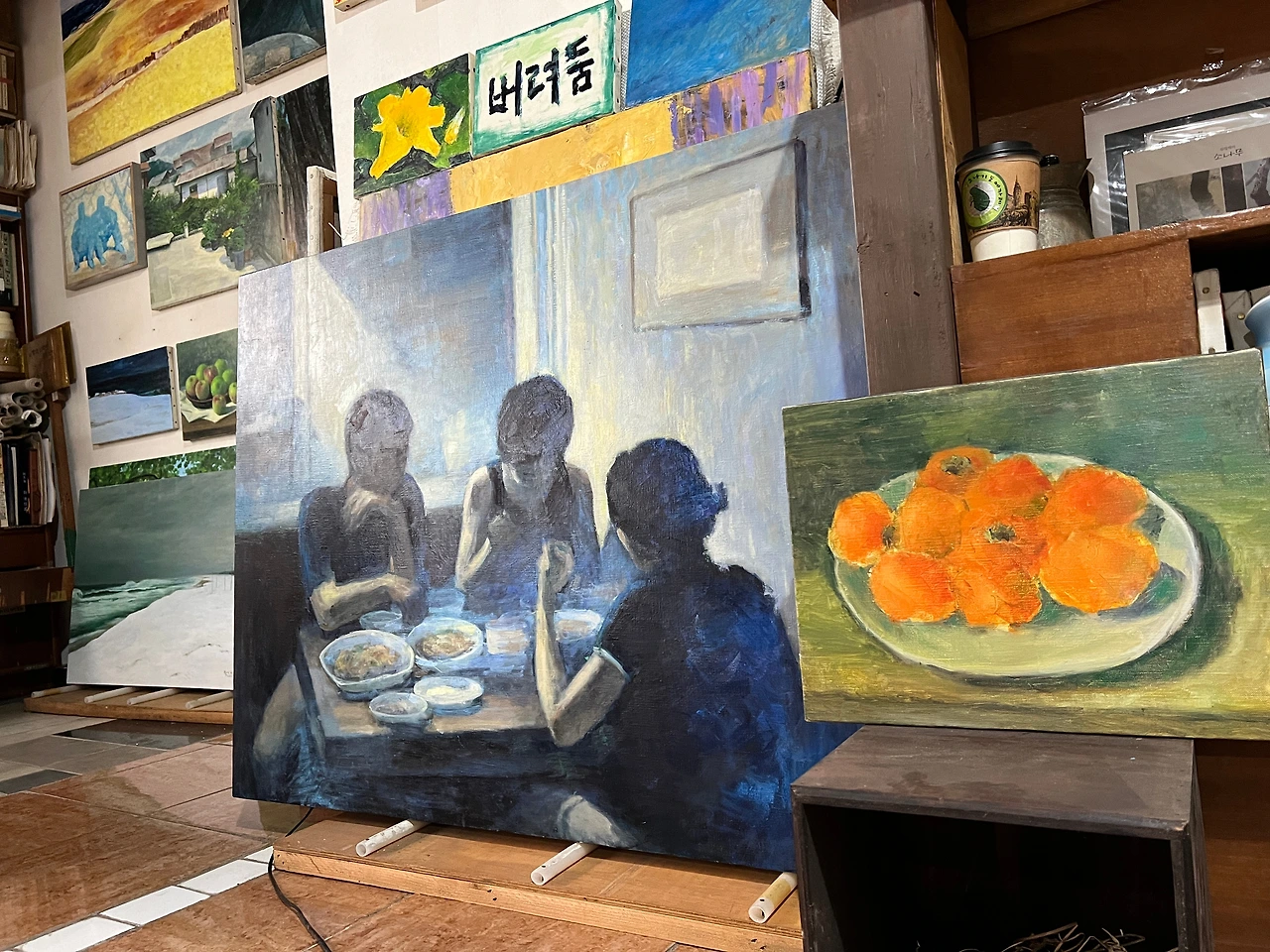 둘째 날은 이 교수님의 고향 선배이기도 한 박수철 화백님의 작업실을 방문하기도 했다. 박 화백은 빛과 그림자를 아주 잘 표현하는 멋진 화가였다. 우리는 박 화백이 만들어주시는 팥빙수를 먹으며 아직 완성되지 않은 그림들을 바라보았다. 아내와 나는 특히 가족이 식사를 하는 그림이 너무 좋았다. ‘구만인상2’라는 작품도 아주 환상적이었는데 우리나라 지도 중 꼬리처럼 톡 튀어나온 곳이 동녁끝 ‘구만(九萬)’이라는 것도 알게 되었다. 화실 밖으로 나오니 바로 옆은 단란주점인데 이름이 ‘지우개’였다. 여기서는 술을 마시고 나쁜 기억을 다 지우는 모양이지? 하고 감탄했더니 아내가 깔깔깔 웃었다.