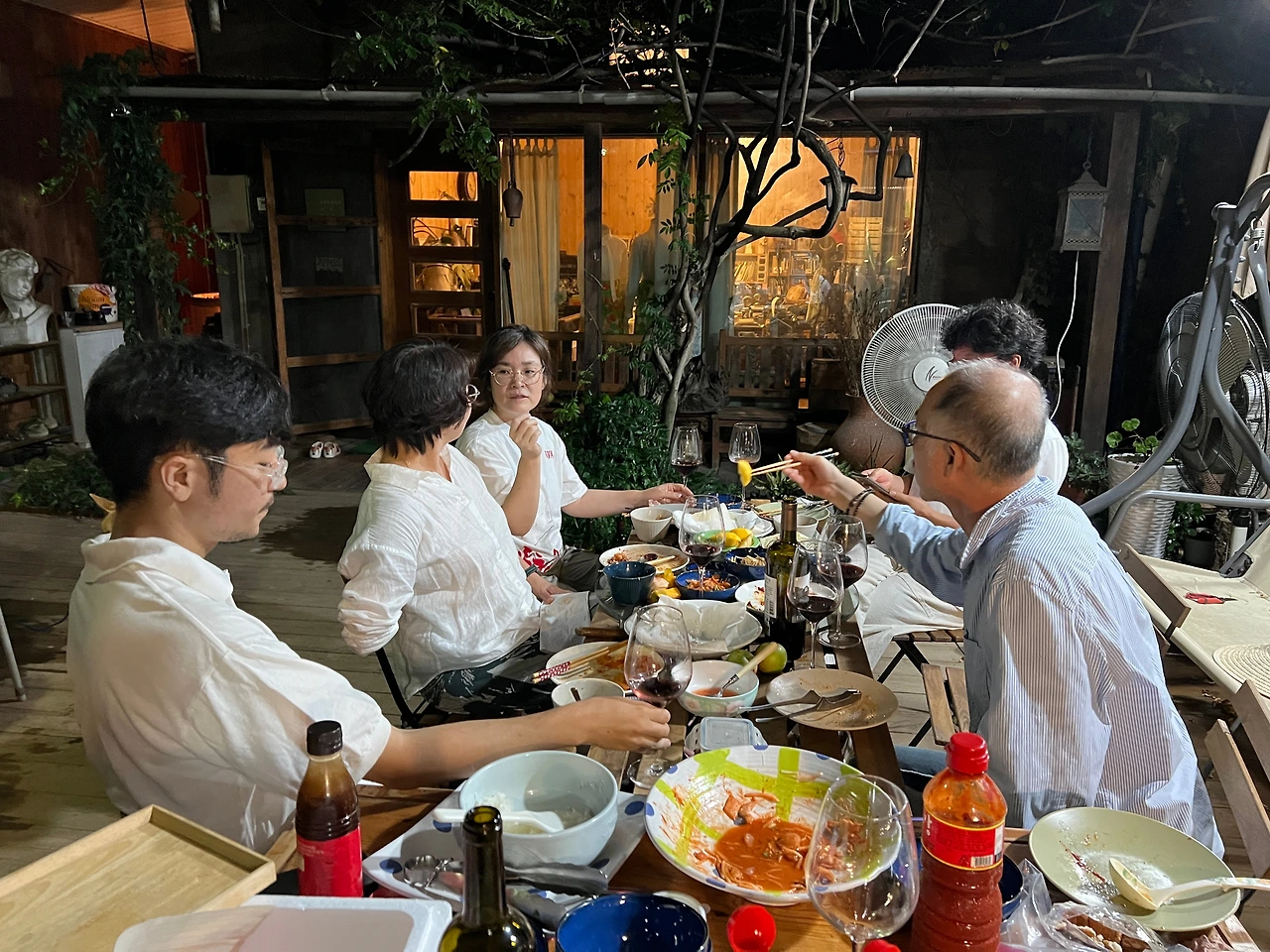 교수님의 따뜻한 환대에 우리는 모두 무장해제했다. 컨테이너들 사이 마당에 차려진 테이블엔 건강한 식재료가 만드는 맛있는 식사가 끼니때마다 즐거움을 주었고 집과 마당 전체에 늘 흐르는 KBS제1FM의 클래식 음악은 현재 삶의 윤기를 더해 주는 것 같았다.