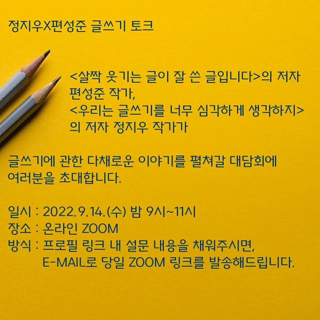 9월 14일 수요일 밤 9시부터 두 시간 동안 줌으로 글쓰기에 대한 이야기를 허심탄회하게 나누는 자리를 만들어 보기로 했습니다. 참가비 같은 건 없고요, linktr.ee/jiwoowriter 타고 들어오셔서 간단하게 신청서 작성해 주시면 됩니다.