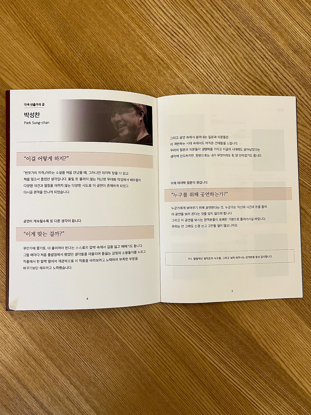 이제는 고전의 반열에 오른 강우석 감독의 영화 《공공의 적》은 송능한 감독의 《넘버 쓰리》와 더불어 재밌는 대사들이 올망졸망 모여 있는 보물상자 같은 작품이다. 나는 특히 칼잡이로 출연한 유해진의 대사들을 좋아하는데 어제는 그가 취조실에 잡혀와서 "복남이파 양복남이는 내기 소싯적에 쑤신 게 맞습니다. 맞는디, 명철이파 조명철이는 난 얼굴도 모른당께요." 라고 하던 대사가 다시 생각났다. 백성희장민호극장에 가서 본 연극 《반쪼가리 자작》의 극단 이름이 '창작조직 성찬파'이기 때문이다. 히 칼잡이로 출연한 유해진의 대사들을 좋아하는데 어제는 그가 취조실에 잡혀와서 "복남이파 양복남이는 내기 소싯적에 쑤신 게 맞습니다. 맞는디, 명철이파 조명철이는 난 얼굴도 모른당께요." 라고 하던 대사가 다시 생각났다. 백성희장민호극장에 가서 본 연극 《반쪼가리 자작》의 극단 이름이 '창작조직 성찬파'이기 때문이다.