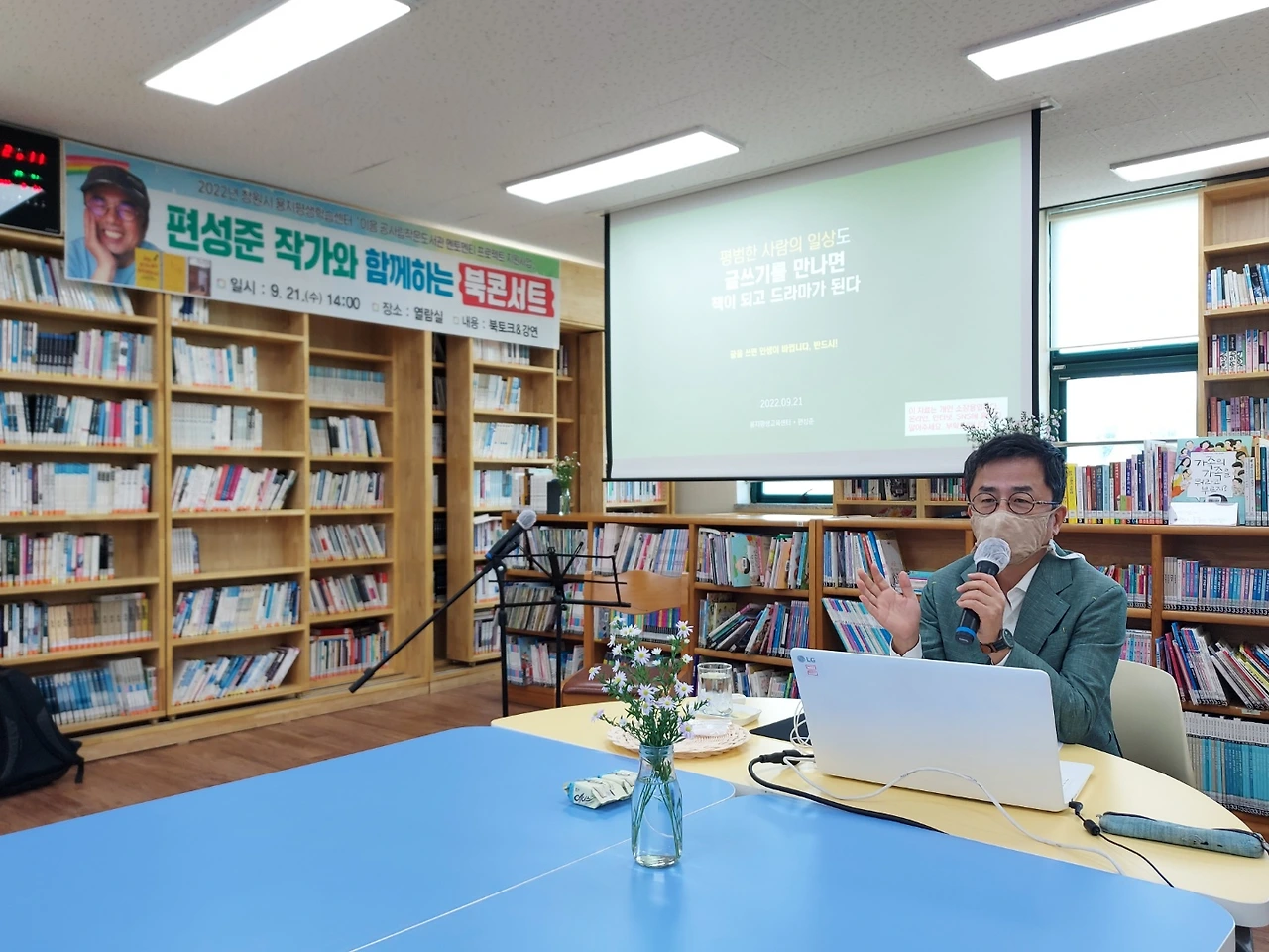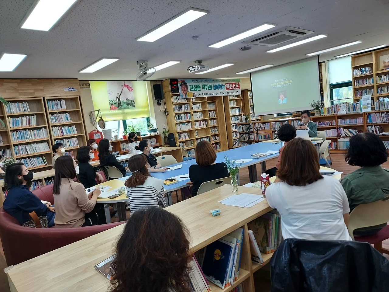 작은 도서관이지만 플랭카드까지 만들어 주셔서 감동했습니다. 스무 명 정도 되는 분들이 오셔서 『부부가 둘 다 놀고 있습니다』 『여보, 나 제주에서 한 달만 살다 올게』 『살짝 웃기는 글이 잘 쓴 글입니다』 등 제 책 세 권에 얽힌 이야기를 주고받았고 평소 글쓰기에 대해 궁금했던 사항을 묻기도 하셨습니다. 저는 ‘평범한 사람의 이야기도 글쓰기를 만나면 책이 되고 드라마가 된다’는 제목으로 제가 아는 한도 내에서 최대한 쉬운 예를 들어가며 열심히 대답을 드렸습니다.