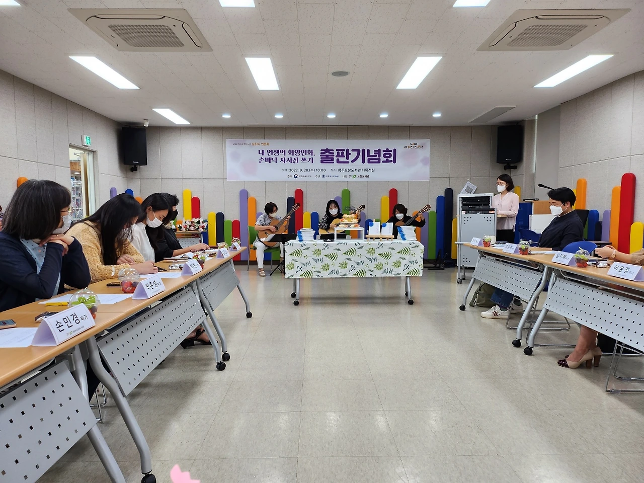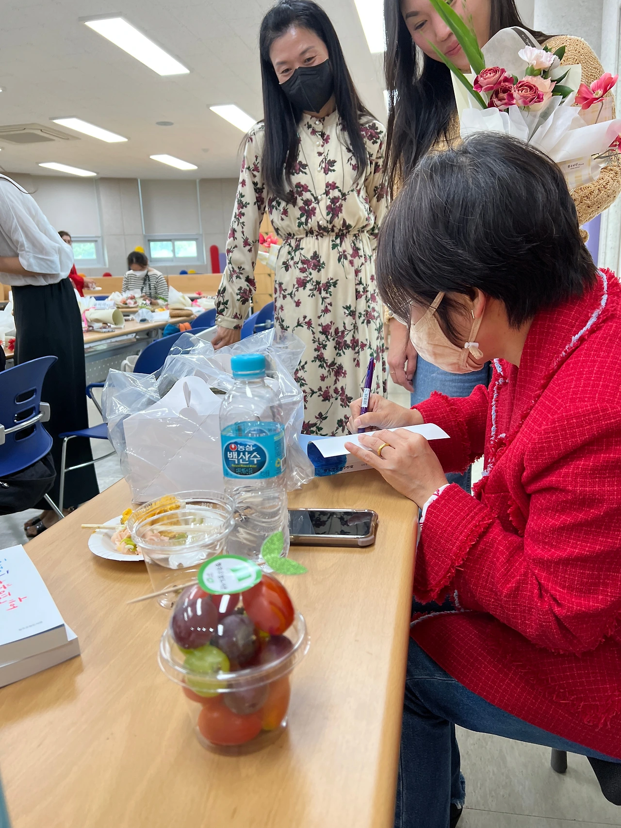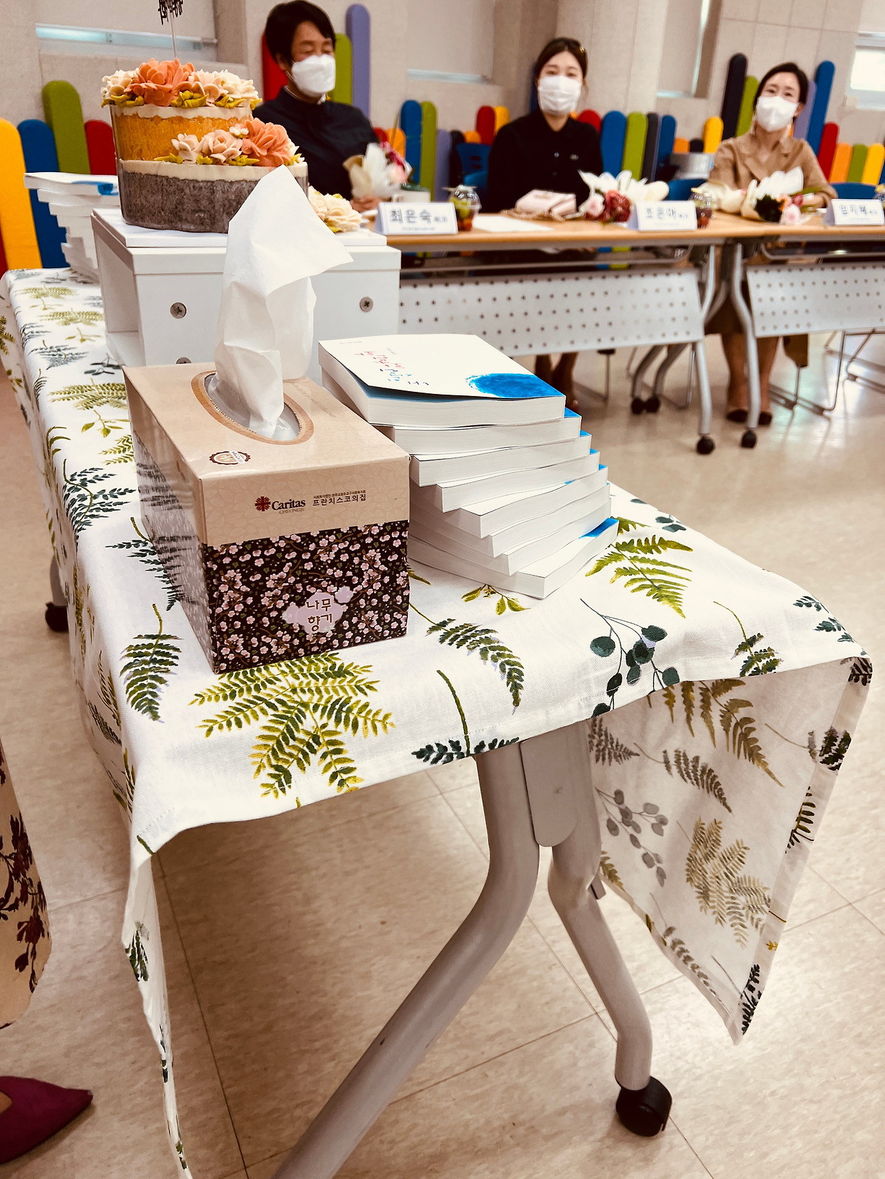 오늘은 이렇게 우여곡절 끝에 만들어진 책을 들고 만나 서로를 축하하고 격려하는 자리였습니다. 책을 들고 나와 각자 자신이 쓴 글을 발췌해 낭독하기로 했는데 몇몇 분은 글을 읽다가 눈물을 참지 못하는 바람에 강연장이 눈물바다가 되기도 했습니다. 할 수 없이 크리넥스를 통째로 책 옆에 두고 낭독을 계속 이어가야 했죠. 하지만 뿌듯하고 기쁜 자리였습니다. 청주오창도서관에서 오늘 행사를 위해 많은 준비를 해주셨고 개인적으로 케이크와 꽃, 선물 등을 가져오신 분도 있었습니다. 윤혜자 씨는 한 작가님에게 브로치를 선물로 받고는 "남편에게도 받아보지 못한 선물을 받았다"는 소감을 남기기도 했습니다. 저는 즉석에서 격려와 축하의 말씀을 드릴까 하다가 오늘 새벽에 일찍 깬 김에 쓴 글을 가져갔습니다. 제목은 '만날 때는 독자였는데 헤어질 때는 작가시군요!'라고 정했습니다.