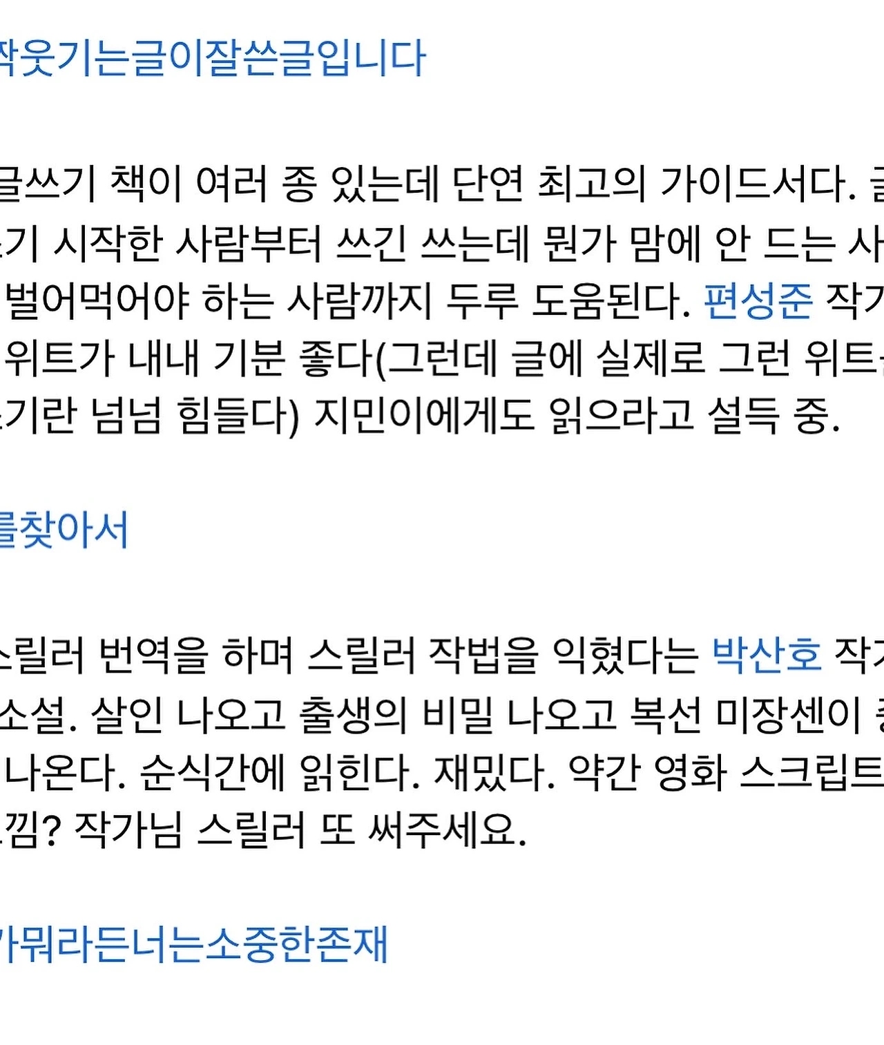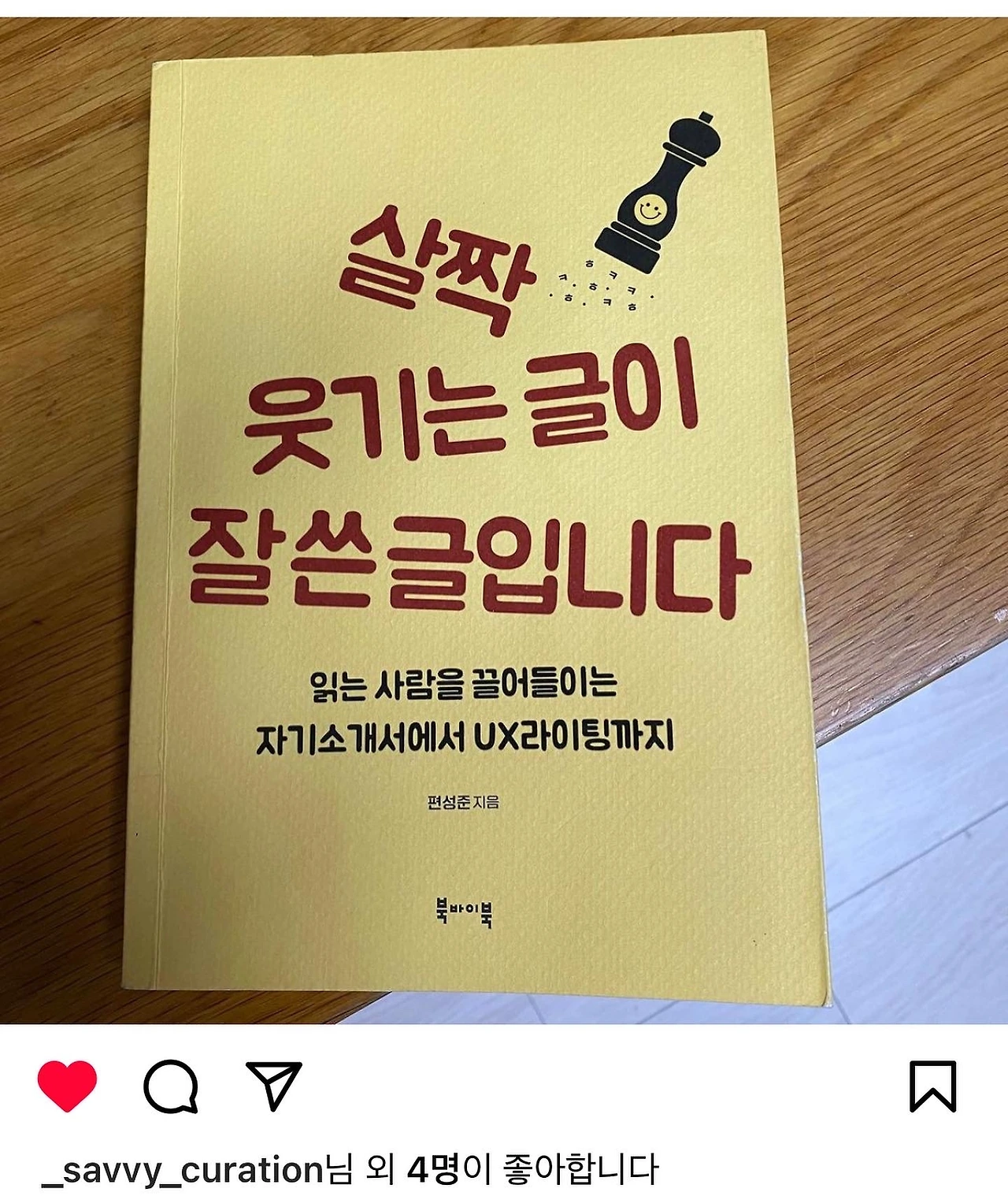인스타그램에 '동네책방영주' 님이 써주신 독후감입니다. 이 분 말고도『살짝 웃기는 글이 잘 쓴 글입니다』를 읽으시고 '글을 쓰고 싶어졌다'고 말씀하시는 분들이 많은데 제겐 그것보다 더 큰 칭찬은 없는 것 같습니다. 그래서 나흘 전 인스타그램에서 이 리뷰를 읽고 그렇게 기뻐했던 것이고요. 페이스북에 '최고의 글쓰기 가이드서'라고 써주신 분도 마찬가지로 고맙고요.