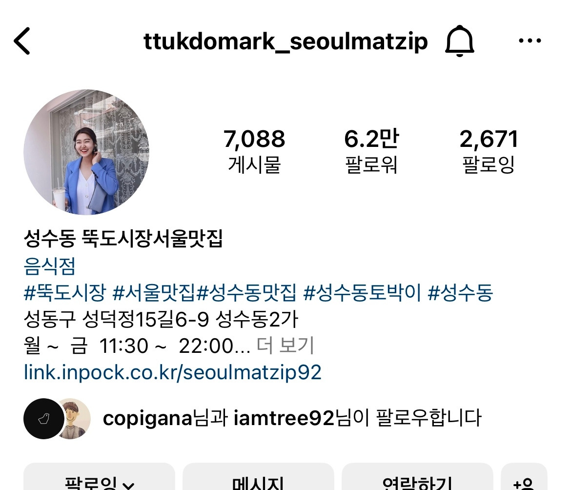 성수동 살 때 아내와 함께 뚝도시장에 서 자주 밥도 먹고 술도 마셨는데 특히 자주 갔던 집이 '준이네'와 ‘서울맛집'이었다. 1986년부터 뚝도시장에서 장사를 해 온 서울맛집은 아내 윤혜자가 올린 글과 사진이 다음 포털 메인화면에 노출되는 바람에 손님이 크게 늘었다며 늘 우리를 반겨 주셨다. 무심코 다닐 땐 몰랐는데 알고 보니 사장님은 이 집의 따님이었고(인스타그램 팔로워가 6만 명이 넘는 인플루언서다) 아버지와 어머니가 직원이었다. 부모님이 운영하다가 2세가 성장하니까 젊은 피를 수혈한 것이다.
