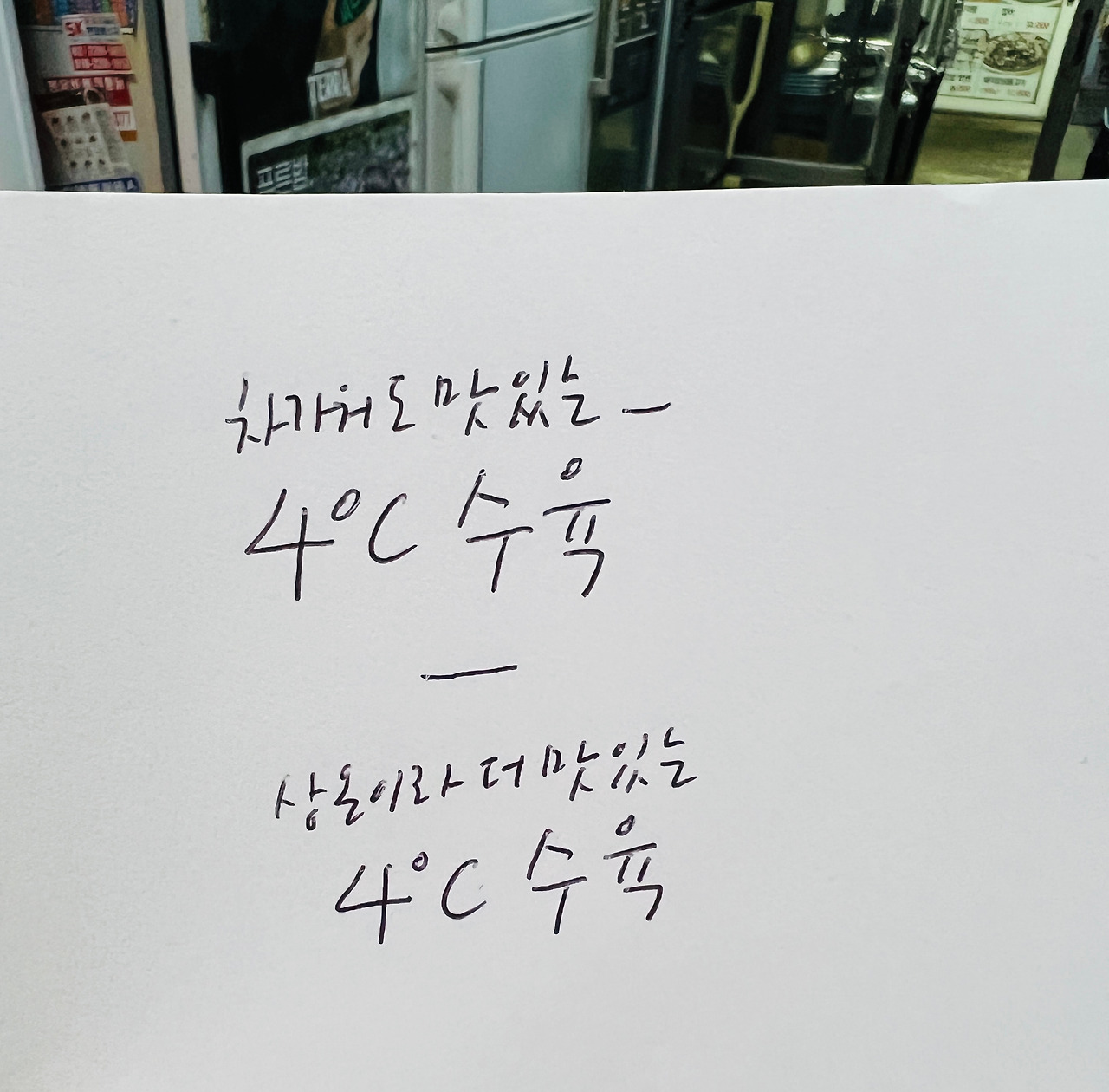 밥을 먹다가 가방에서 노트를 꺼내 한 장을 찢어 메모를 시작했다. 뜨겁지 않다는 걸 어떻게 표현하면 좋을까 하다가 섭씨로 고기의 온도를 표시하면 어떨까 하는 생각이 들었다. 종이 위에 '차가워도 맛있는 4℃ 수육'과 '상온이라 더 맛있는 4℃ 수육' 이렇게 두 가지 슬로건을 써서 보여 주었다. 사장님과 이야기를 나누고 있는데 아버지가 들어오시더니 내가 쓴 슬로건을 보고 매우 기뻐하셨다. 어떻게 그렇게 금방 4℃ 수육이라는 생각을 했냐고 칭찬하시면서 딸에게 감자탕 값을 받지 말라고 외쳤다. 그러나 나는 이미 현금으로 계산을 한 상태였으므로 사장님은 울상을 지으셨다. 내가 아내와 함께 나중에 다시 오겠다고 했더니 그때는 위장을 텅텅 비우고 오시라며 웃으셨다. 아버지는 내 근황을 물으며 다른 손님은 다 잊어도 이상하게 '편성준'이라는 이름은 잊히지 않는다고 하셨다. 고마운 말씀이었다. 시장에 오면 늘 살아 있다는 느낌이 든다. 올 때마다 따뜻한 사람들을 만나니 그런 것 같다.