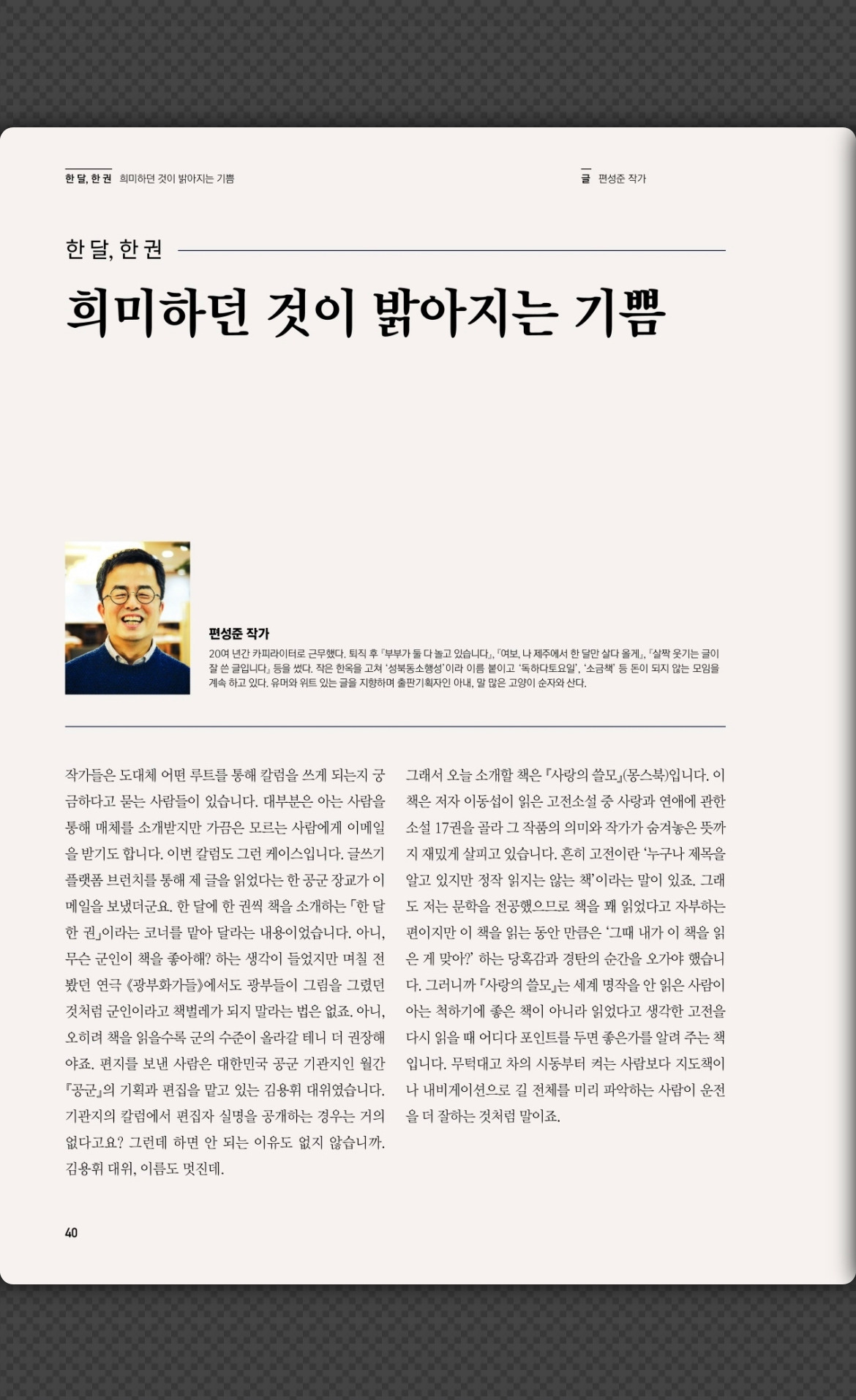 작가들은 도대체 어떤 루트를 통해 칼럼을 쓰게 되는지 궁금하다고 묻는 사람들이 있습니다. 대부분은 아는 사람을 통해 매체를 소개받지만 가끔은 모르는 사람에게 이메일을 받기도 합니다. 이번 칼럼도 그런 케이스입니다. 브런치를 통해 제 글을 읽었다는 한 공군 장교가 이메일을 보냈더군요. 한 달에 한 권씩 책을 소개하는 「한 달 한 권」이라는 코너를 맡아 달라는 내용이었습니다. 아니, 무슨 군인이 책을 좋아해?라는 생각이 들었지만 며칠 전 봤던 연극 《광부화가들》에서도 광부들이 그림을 그렸던 것처럼 군인이라고 책벌레가 되지 말라는 법은 없죠. 아니, 오히려 책을 읽을수록 군의 수준이 올라갈 테니 더 권장해야죠. 편지를 보낸 사람은 대한민국 공군 기관지인 월간 『공군』의 기획과 편집을 맡고 있는 김용휘 대위였습니다. 기관지의 칼럼에서 편집자 실명을 공개하는 경우는 거의 없다고요? 그런데 하면 안 되는 이유도 없지 않습니까. 김용휘 대위, 이름도 멋진데.