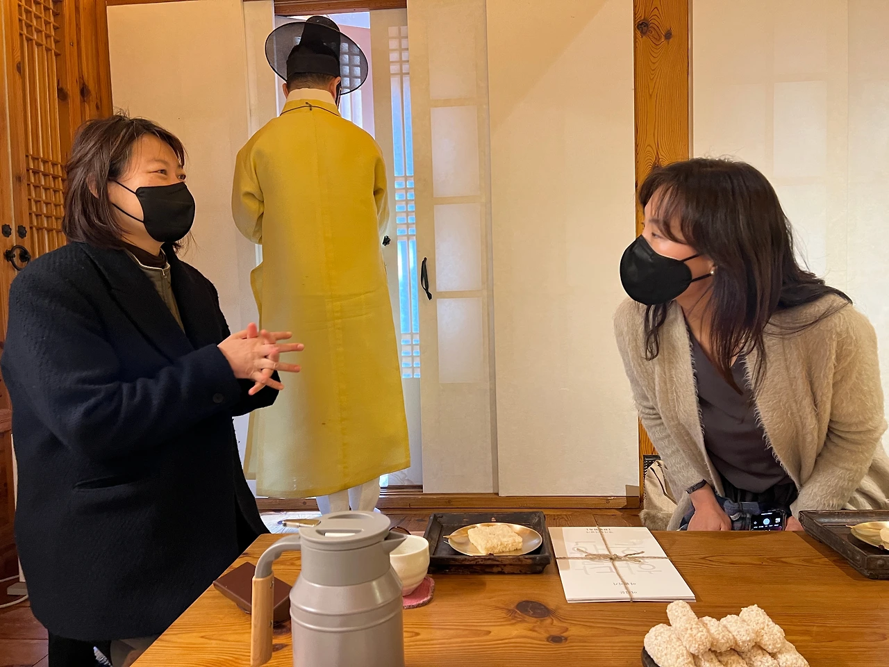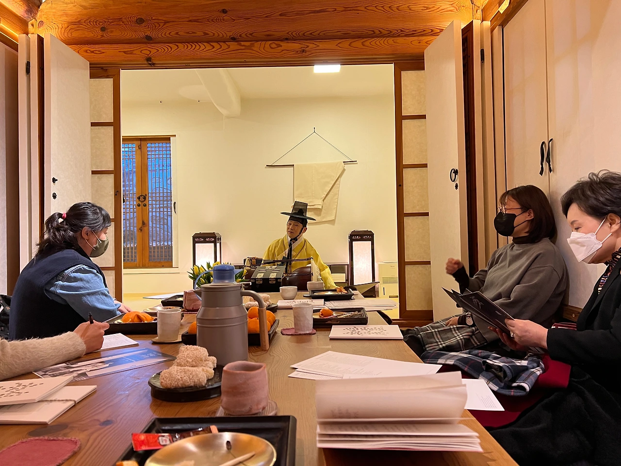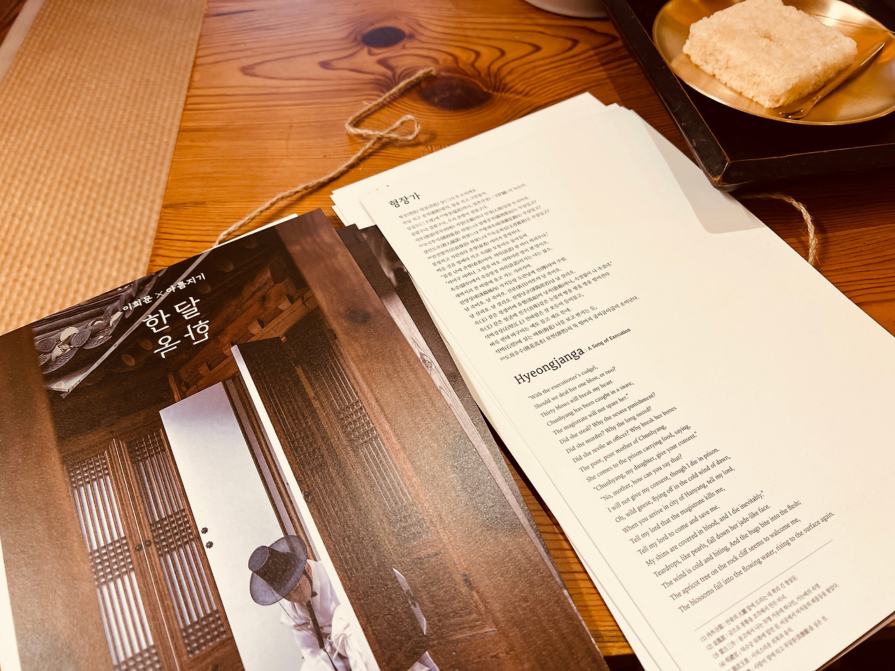 헌법재판소를 지나 왼쪽으로 돌면 나타나는 아름지기 한옥으로 들어서니 진행자 여성 한 분과 소리꾼 이희문이 보였는데 제가 인사를 하자 "식사는 하셨어요? "라고 이희문 선생이 무람하게 물어서 금방 마음이 편해졌습니다. 방으로 들어가 벽장 안에 있는 옷걸이와 신발장에 외투와 운동화를 수납하고 앉아 있는데 누가 반갑게 알은체를 하며 들어오는 것이었습니다. 마스크를 벗고 보니 거문고를 하는 안정희 선생이더군요. 안 선생은 저희 집에서 하는 '소금책'에도 두 번 오셨고 현경채 선생의 북토크에서 사회를 보기도 했던 분입니다. 조금 있다가 최예선 작가도 오신다고 하며 반갑게 웃었습니다.