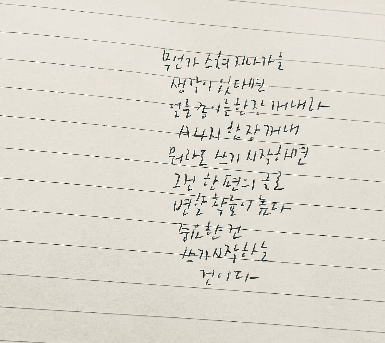 '나는 작가가 아닌데 글을 쓰고 싶다. 어떻게 하면 글을 쓸 수 있느냐?'라고 묻는 분들에게 뻔하지만 요긴한 답을 하나 드릴까요. 일단 뭔가 떠오르면 얼른 종이를 한 장 꺼내십시오. 그래서 뭐라도 쓰기 시작하면 그건 한 편의 글로 변할 확률이 높습니다. 종이 대신 스마트폰을 꺼내도 좋습니다. 중요한 건 쓰기 시작한다는 것입니다. 그리고 그걸 매일 아침 정해진 시간에 계속하면 당신은 작가가 될 수 있습니다. 어제 워크숍에 오신 분이 오늘 아침 일찍 일어나 글쓰기 루틴을 시작다고 인스타그램 스토리에 올리셨네요. 저는 이 분이 훌륭한 작가가 될 수 있을 것이라 확신합니다. 쓸 거다 쓸 거다 말만 하지 않고 이미 쓰기 시작했으니까요.