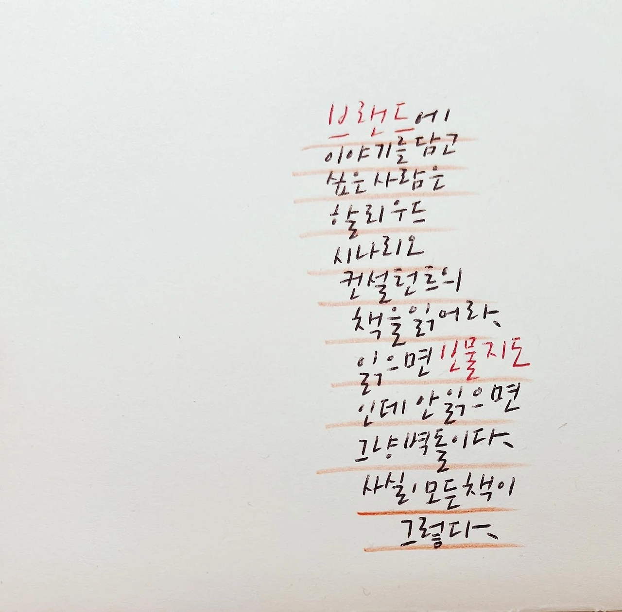 나는 내 글씨가 마음에 안 들었다. 그런데 농담이 아니라 '공처가의 캘리'를 꾸준히 쓰면서 글씨가 늘었고 이제는 나도 내 글씨를 좋아하게 되었다. 그래서 이렇게 새벽에 일어나 글씨를 쓰고 그걸 찍어 올리는 미친놈이 되었다. 뭐든 꾸준히 하면 쌓인다. 시작은 미약하더라도 차곡차곡 쌓이는 것의 힘을 보여주는 사람이 되고 싶다.