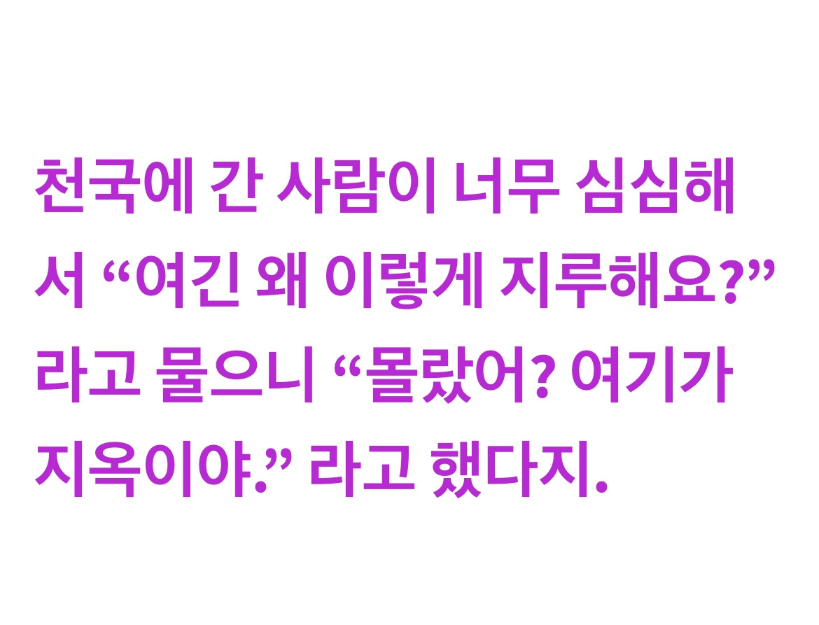 천국이 너무 심심해서 “여긴 왜 이렇게 지루해요?”라고 물으니 “몰랐어? 여기가 지옥이야.”라고 대답했다던 에피소드가 생각나서 써봤다. 살짝 웃기거나 살짝 한심한 글이 좋은 글이라고, 나는, 아직도 믿고 있다(인스타그램에서‘#편성준작가님‘이라는 자가당착적인 해시태그로 검색을 했다가 발견한 인친의 독후감에 용기를 얻어 쓴 글이기도 함).