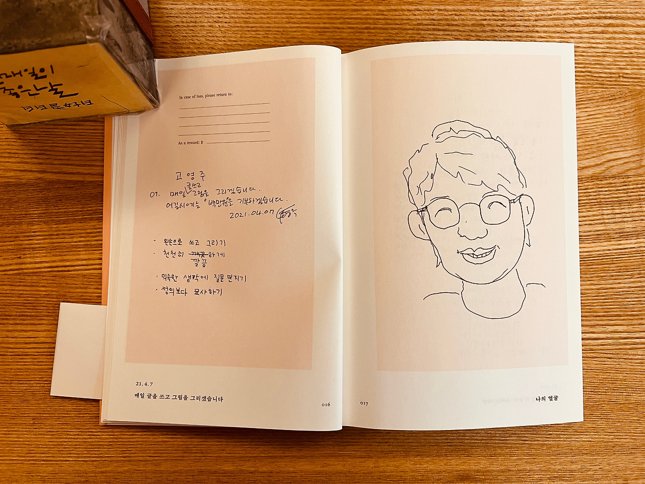 쇼콜라티에에게 손이 아프다는 건 어떤 의미일까요. 주로 서서 일을 하는 쇼콜라티에는 목부터 다리까지 망가지기 쉽다고 합니다. 그러나 제일 걱정은 손이 말을 듣지 않는 것이겠죠. 초콜릿을 만들어야 하니까요. 인류가 엄지손가락을 움직일 수 있어서 만물의 영장이 되었다는 이야기가 생각났습니다. 당장 글을 쓰는 저만 해도 손가락이 말을 듣지 않았을 때의 공포감을 느낀 적이 있습니다. 갑자기 손가락이 미친 듯이 아파 노트북 자판을 치지 못한 적이 있었던 것입니다. 무서워서 정형외과로 달려가보니 손가락에 염증이 생겨 그렇다고 하더군요. 주사를 맞고 약을 먹는 등 호들갑을 떤 지 며칠이 지나서야 제 손가락은 예전으로 돌아갔습니다. 하지만 저처럼 예전 손가락으로 돌아가지 못한 고 대표는 왼손으로 일기를 쓰기 시작합니다. 도대체 왼손으로 글을 쓰고 그림을 그리면 얼마나 힘이 들까요. 힘이 들면 하다가 멈추어도 누가 뭐라 하지 않겠지 하는 생각이 들게 마련입니다. 고 대표도 그는 게 두려워서인지 스스로에게 옵션을 겁니다. 매일 글 쓰고 그림을 그리는 일을 멈출 시엔 어딘가에 백만 원을 기부하겠다고. 그러면서 왼손으로 쓰니 처음 글씨를 배우던 아이처럼 생각도 표현도 단순해지는 것 같다며 좋아합니다. 정말 못 말립니다.