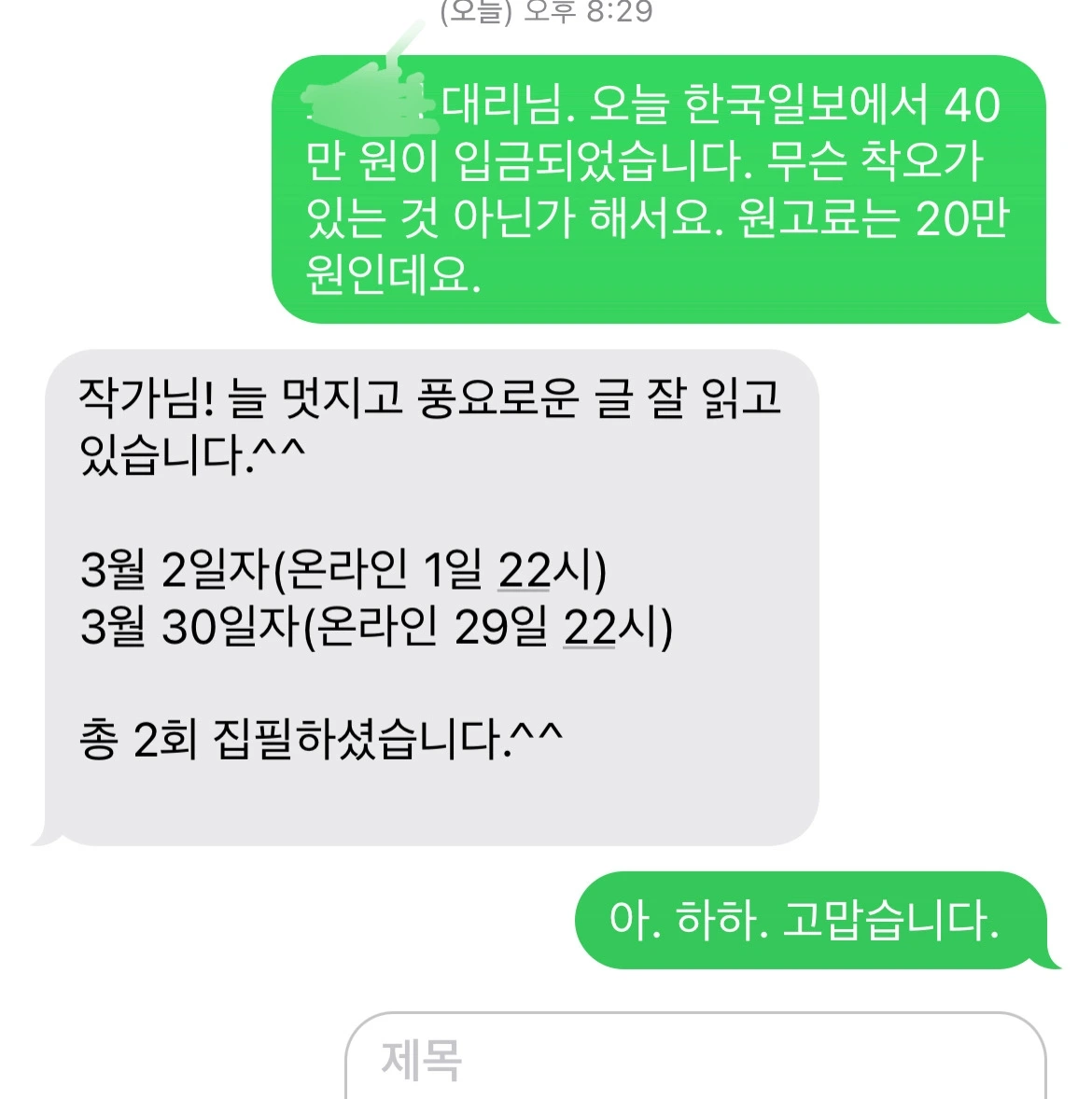 오늘은 주택자금대출부터 의료보험, 국민연금 등 온통 돈이 빠져나가기만 하는 날이라 생각했는데 난데없이 카카오뱅크로 40만 원이 입금되었다. 돈을 보내온 곳은 한국일보사였다. 신문 칼럼 원고료는 20만 원인데 왜 40만 원을 보냈을까?. 지난달에도 지지난달에도 20만 원이었는데. 설마 그동안 원고료가 두 배로 늘었을 리는 없고. 보너스인가? 좋으면서도 불안했다. 가만히 있으려다가 그래도 꺼림칙해 한국일보 담당자에게 문자메시지를 보내 물어보았다. 이유인즉슨 3월 2일 자와 3월 30일 자 두 번 칼럼을 써서 그렇단다. 그러니까 다음 달엔 원고료가 안 나온다는 얘기다. 일종의 조삼모사다.