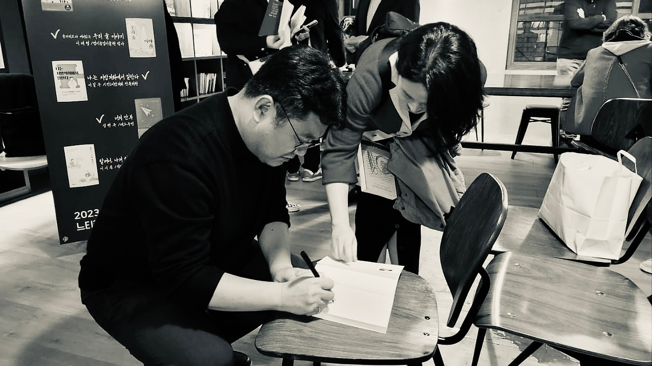 마지막 작가 사인 시간엔 느티서점에서 구입한 책을 들고 작가님에게 오신 분이 많았습니다. 다섯 작가의 책은 물론 저와 윤혜자의 책을 들고 와 사인을 부탁하는 분들도 있어 감동했습니다. 부부가 함께 오신 분 중 남편께서 “저도 실수를 많이 하는 성향이라 ‘부부가 둘 다 놀고 있습니다’를 반갑게 읽었는데 아까 성현주 작가 소개하면서 봉숭아학당을 또 영구학당이라고 잘못 말하는 걸 보고 아, 역시 거짓말이 아니었구나 생각했습니다.”라고 말해서 낄낄낄 웃기도 했습니다. 당일 몇 권이나 팔릴지 몰라 서점에서 책을 적게 가져다 놓은 것 같다고 행사를 진행해 준 김혜민 선생이 안타까워하기도 했습니다. 저희 집 옆방에 사는 김혜민 선생은 어제 인원 체크부터 안내, 장소 관리, 촬영 등 많은 수고를 해주었습니다. 고맙습니다. 한기호 소장님은 가시기 전에 권오준 작가의 『강연자를 위한 강연』이라는 책을 꺼내 제게 건네주셨습니다. 저의 글쓰기 강연이 더 많아지고 점점 더 확대되길 바라는 마음에 주신 거겠죠. 고맙습니다.