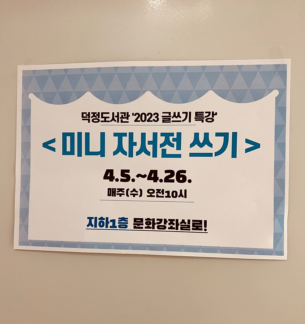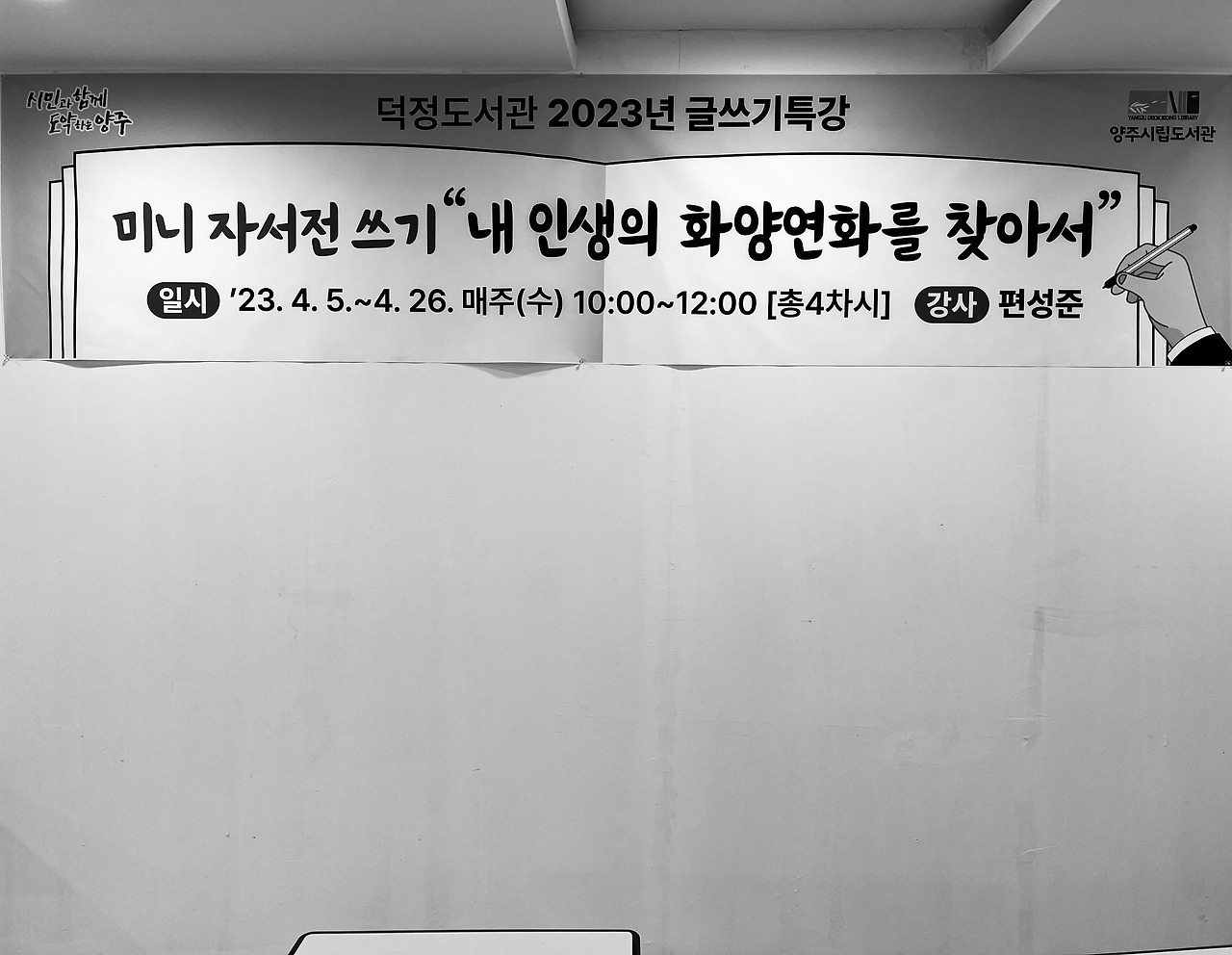 양주에 있는 덕정도서관에서 ‘미니 자서전 쓰기’ 강의를 하고 있다. 제목에 자서전이 들어 있어 은퇴한 분들만 올 것 같지만 사실은 그렇지 않고 젊은 수강생도 있다. 어제가 세 번째 시간이었는데 내 글쓰기 강의를 듣고 생애 처음으로 글을 써봐야겠다 생각한 분이 둘이나 계셨다. 생각만 한 게 아니고 실제로 글을 쓰기 시작했다고 하니 너무 기쁜 일이다.