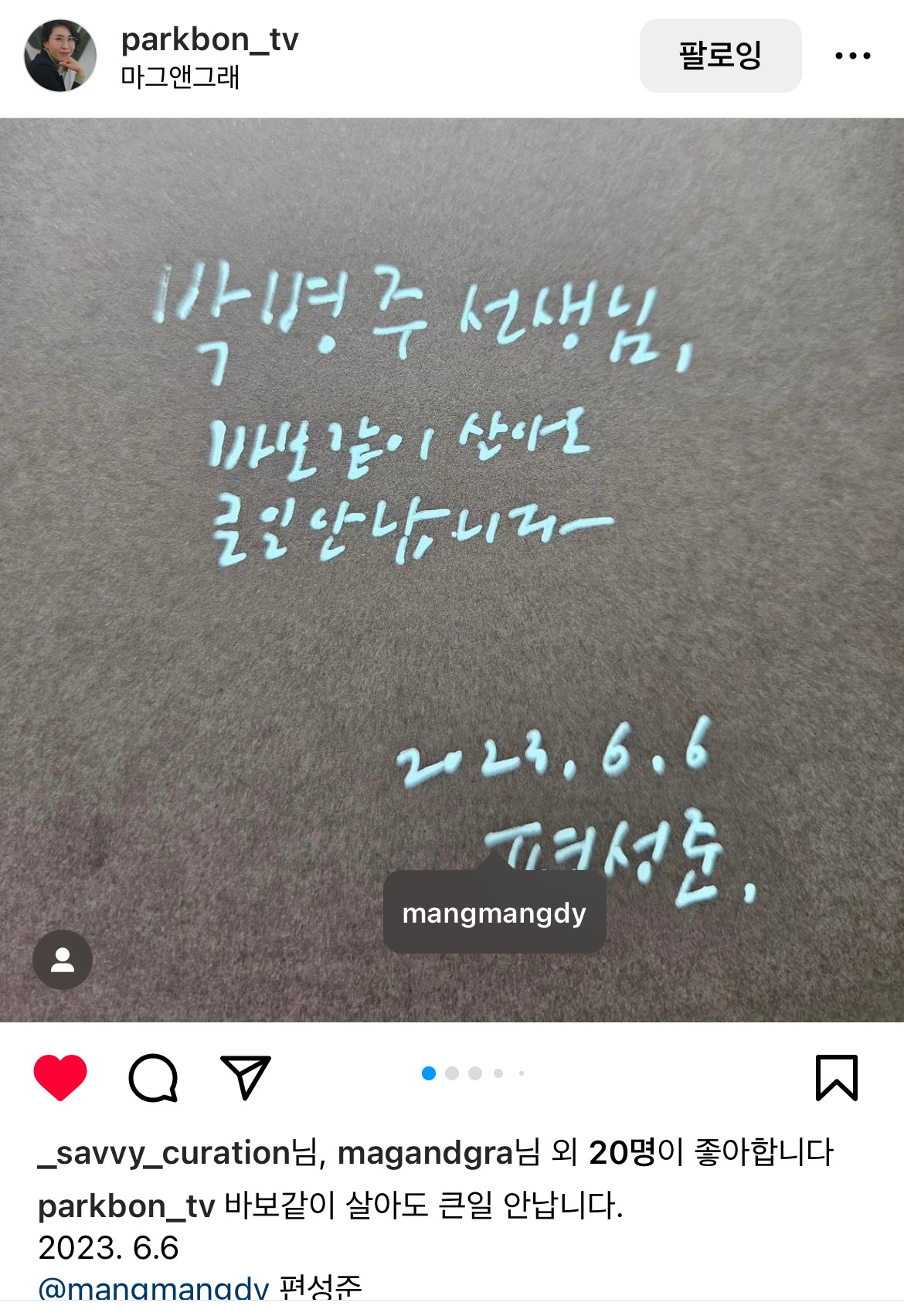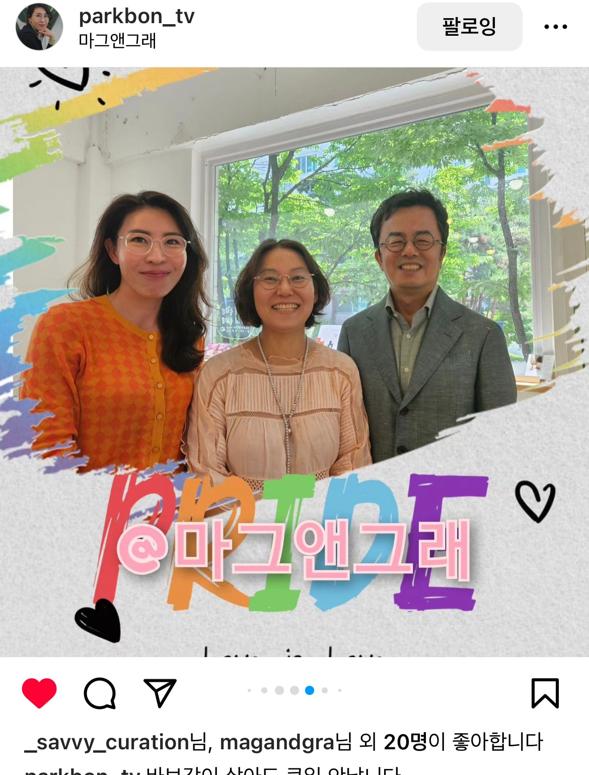 두 시간이 순식간에 지나갔습니다. 제 책과 윤혜자 책을 가져온 분들이 계셔서 사인을 해드리고 사진도 찍었습니다. 박병주 선생은 '바보 같이 살아도 큰일 안 납니다'라는 저의 사인에 순간 울컥했다고 인스타그램에 글을 남기셨고 안은경 선생은 "웃고 싶어 죽겠는데 도무지 웃지 못하고 있을 때 『부부가 둘 다 놀고 있습니다』를 읽고 크게 웃었다"는 감동적인 독후감을 남기기도 하셨습니다. 모두 은인처럼 고마운 분들입니다.