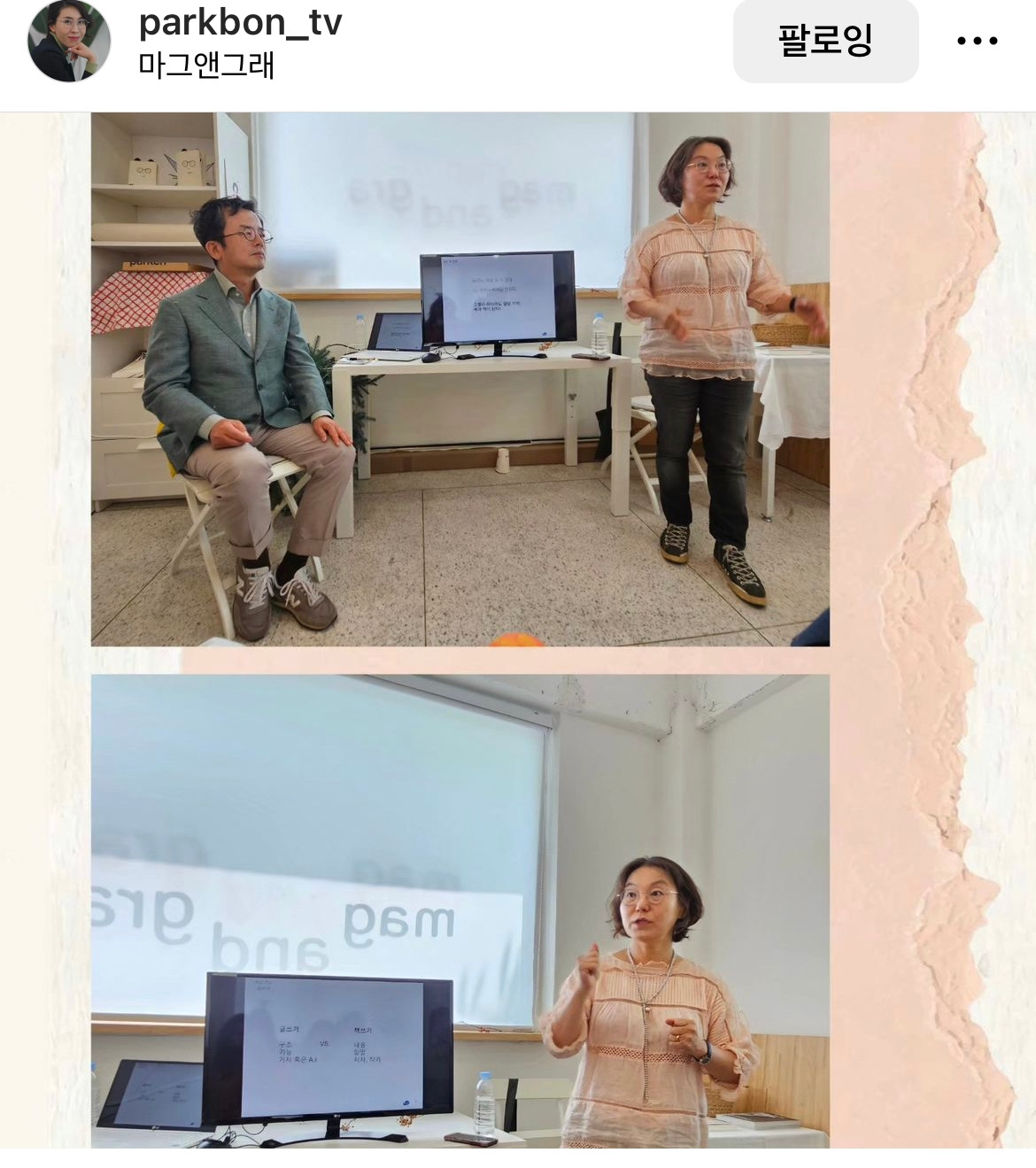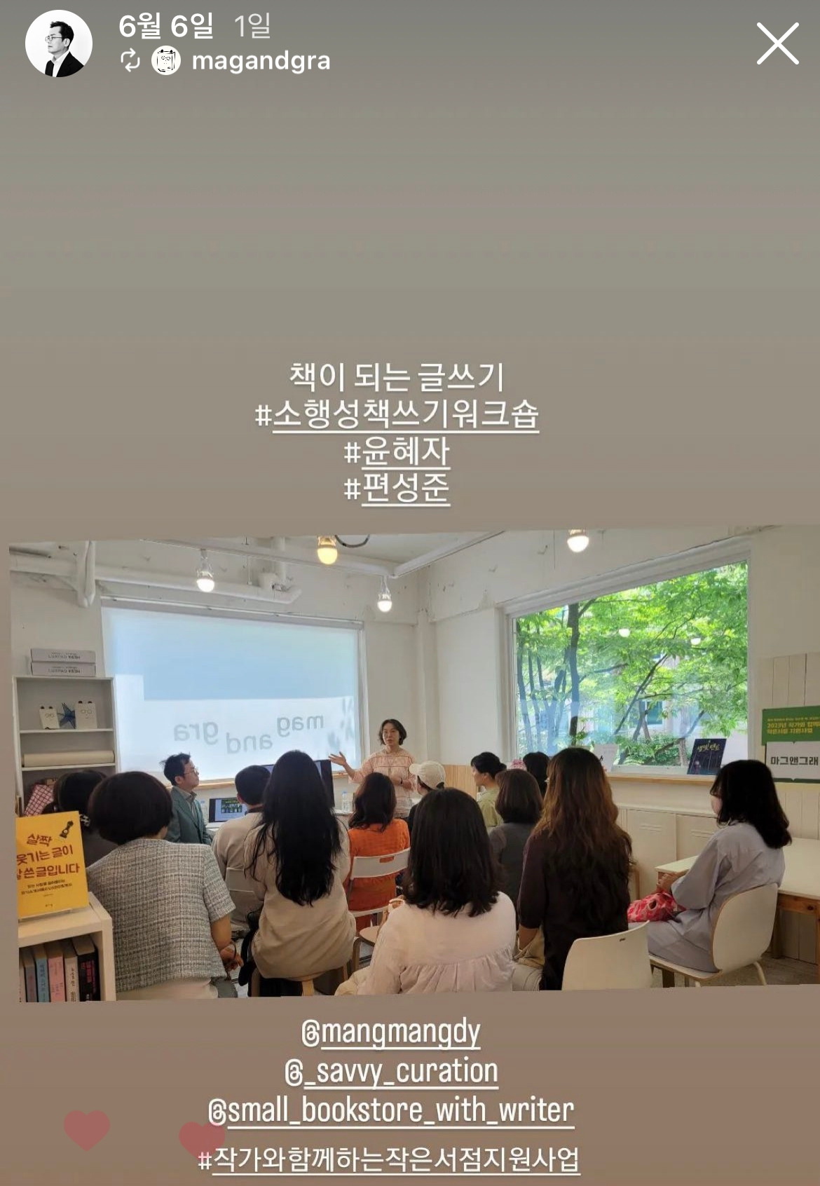 어제 수원에 있는 책방 마그앤그래에서 윤혜자 작가의 '책이 되는 글쓰기'라는 제목의 강연이 있었습니다. 이소영 대표께서 제가 4주간 진행했던 '살짝 웃기고 눈물도 핑 도는 에세이 쓰기'에 이어서 출판기획자인 윤혜자도 하루 특강을 해주면 좋겠다고 해서 성사된 행사였죠. 현충일인데도 불구하고 많은 분들이 와주셨습니다. 심지어 저희들을 보고 "연예인을 만나는 기분"이라고 해주신 분까지 계셔서 몹시 쑥스럽고 고마운 기분이었습니다.