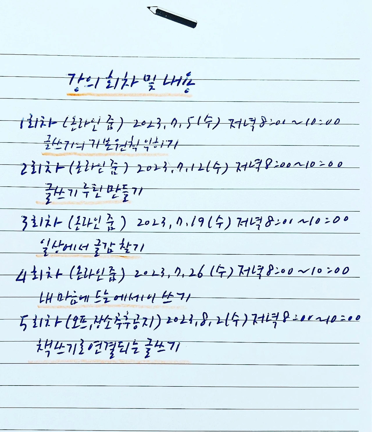 글쓰기의 기본 원칙 익히기 : 막연한 글쓰기, 어떻게 시작해야 할까? /에세이 쓰기 3단계 (구조 잡기-메시지 넣기-마감 하기)/유명 작가가 쓴 에세이 함께 읽어보기/10분 글쓰기(글쓰기 주제는 당일 제시)