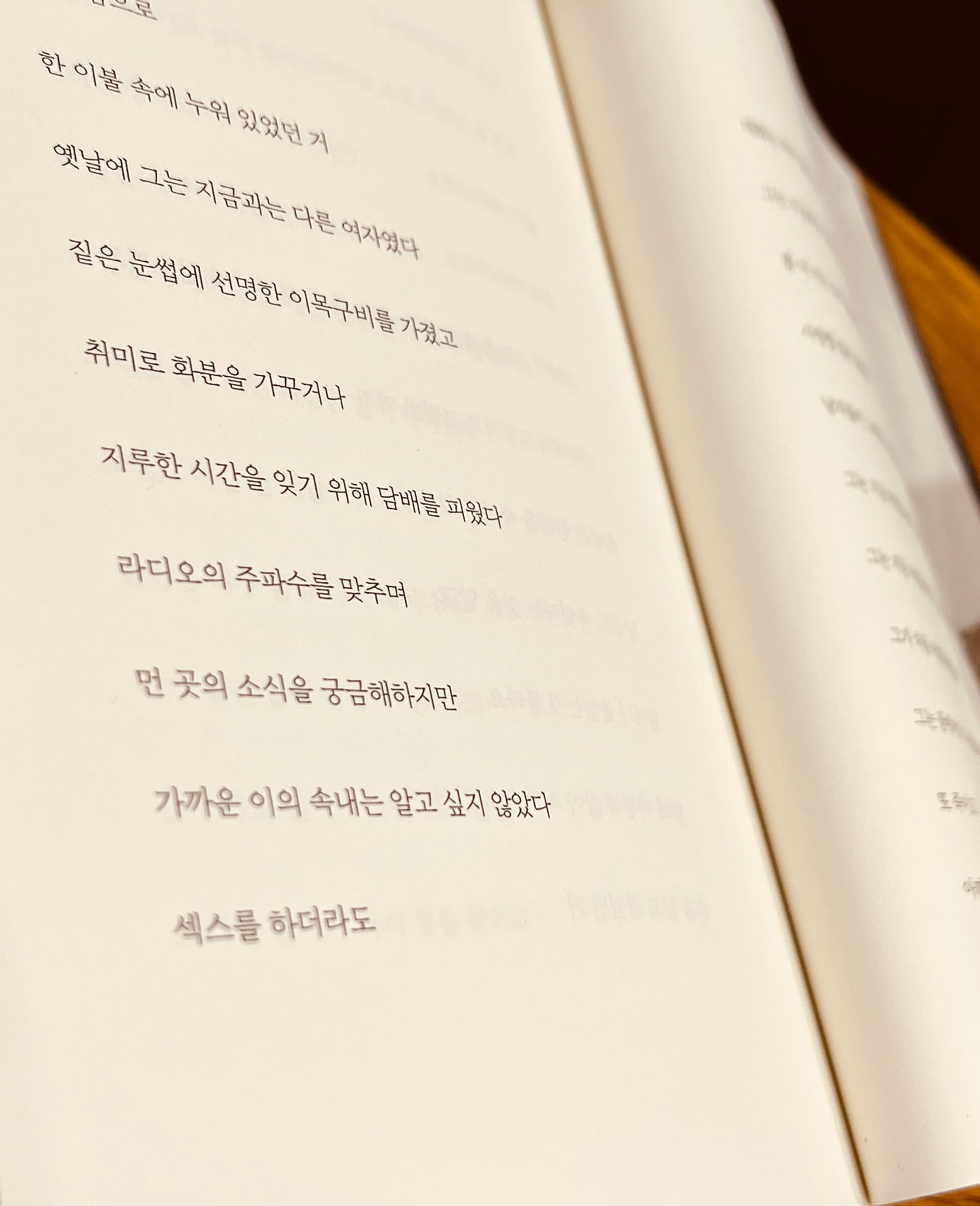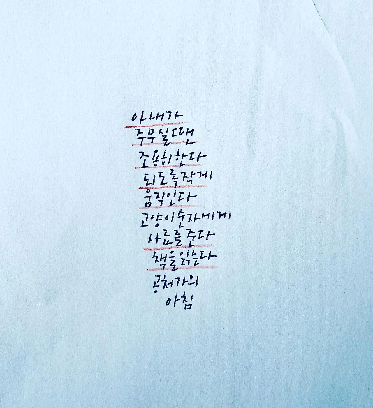 아침에 일어나 물을 마시고 화장실에 가서 어제 산 유진목의 시집에서 '라디오의 주파수를 맞추며 먼 곳의 소식을 굼궁해하지만 가까운 이의 속내는 알고 싶지 않았다'라는 구절에 감탄했다. 아내가 아직 자고 있으므로 화장실도 마당에 있는 걸 사용했다. 마루로 들어와 나를 보고 오는 순자에게 사료를 챙겨주고 공처가의 캘리를 써보았다. 아내가 잘 땐 되도록 조용히 움직이고 생활소음도 작게 낸다는 내용이었다. 두 편을 써봤는데 ' 아내가 주무실 땐 조용히 한다 '라는 구절은 똑같았다. 아무래도 이 구절이 나의 중심 이데올로기인 것 같다.