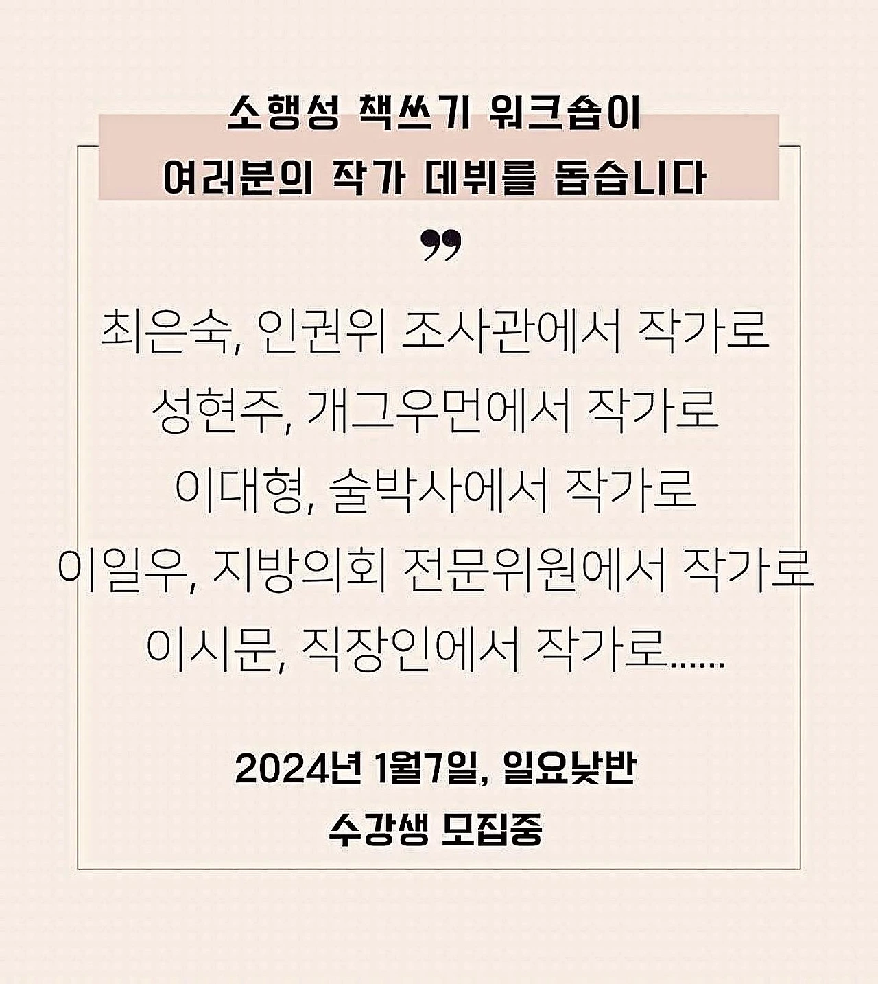 소행성 책쓰기 워크숍 16기는 2024년 1월 7일 일요일 오후 한 시에 시작합니다. 5.5개월 간 진행되며 정원 6명 소수정예입니다. 현재 2석 남았습니다.