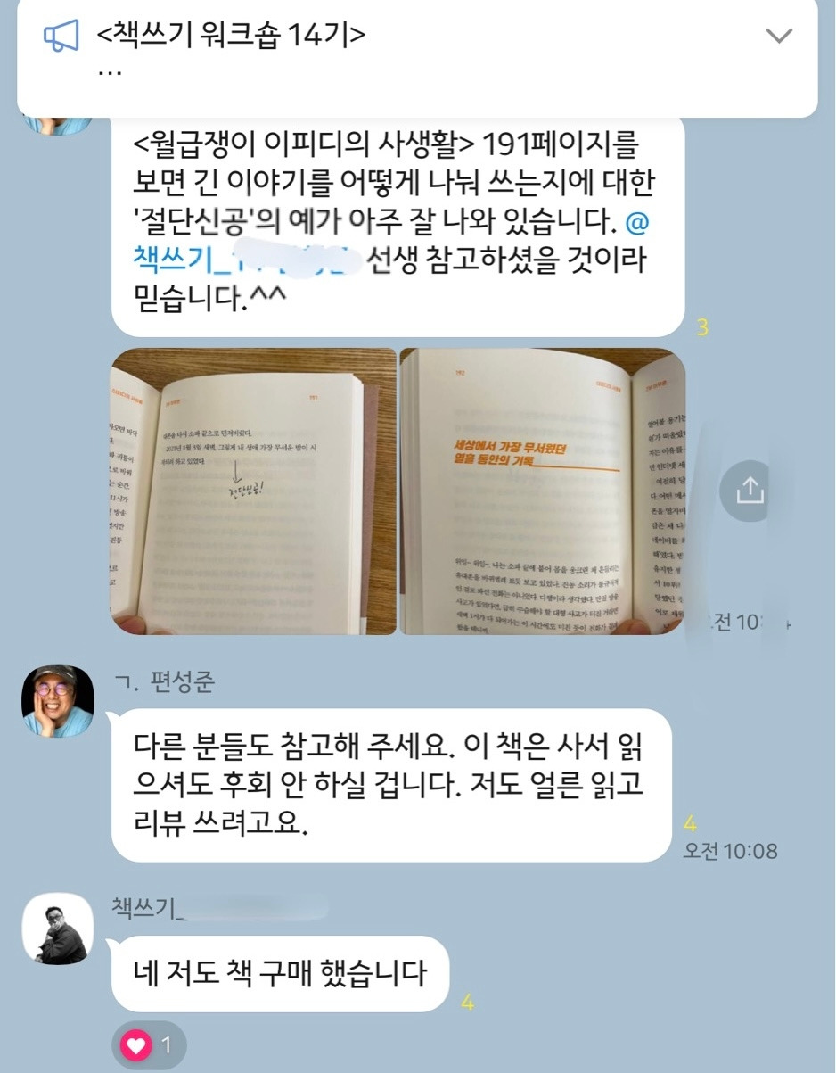 자신의 일과 에세이가 섞인 장르를 일컫는 '업세이'라는 신조어가 몇 년 전에 나왔는데 내 생각에 이 책이야말로 특급 업세이다. 책을 읽는 동안 촉이 왔다. 아, 이거 베스트셀러는 아니더라도 준 베스트셀러는 되겠구나. 마침 오늘 아침에 저자와 카톡으로 이야기를 나누었는데 다음 주에 2쇄를 찍는단다. 역시 눈 밝은 독자들은 좋은 책을 귀신 같이 알아본다. 일독을 권한다. 선물용으로도 좋다. 오늘 아침에 나는 소행성 책쓰기 워크숍 멤버들에게 카톡으로 이 책 영업을 했다. 정말로 이 책은 첫 책을 쓰고 싶은 사람들에게도 강추다. 일단 독자를 빨아들이는 글발이 좋으니 얼른 사서 읽어보시기 바란다.