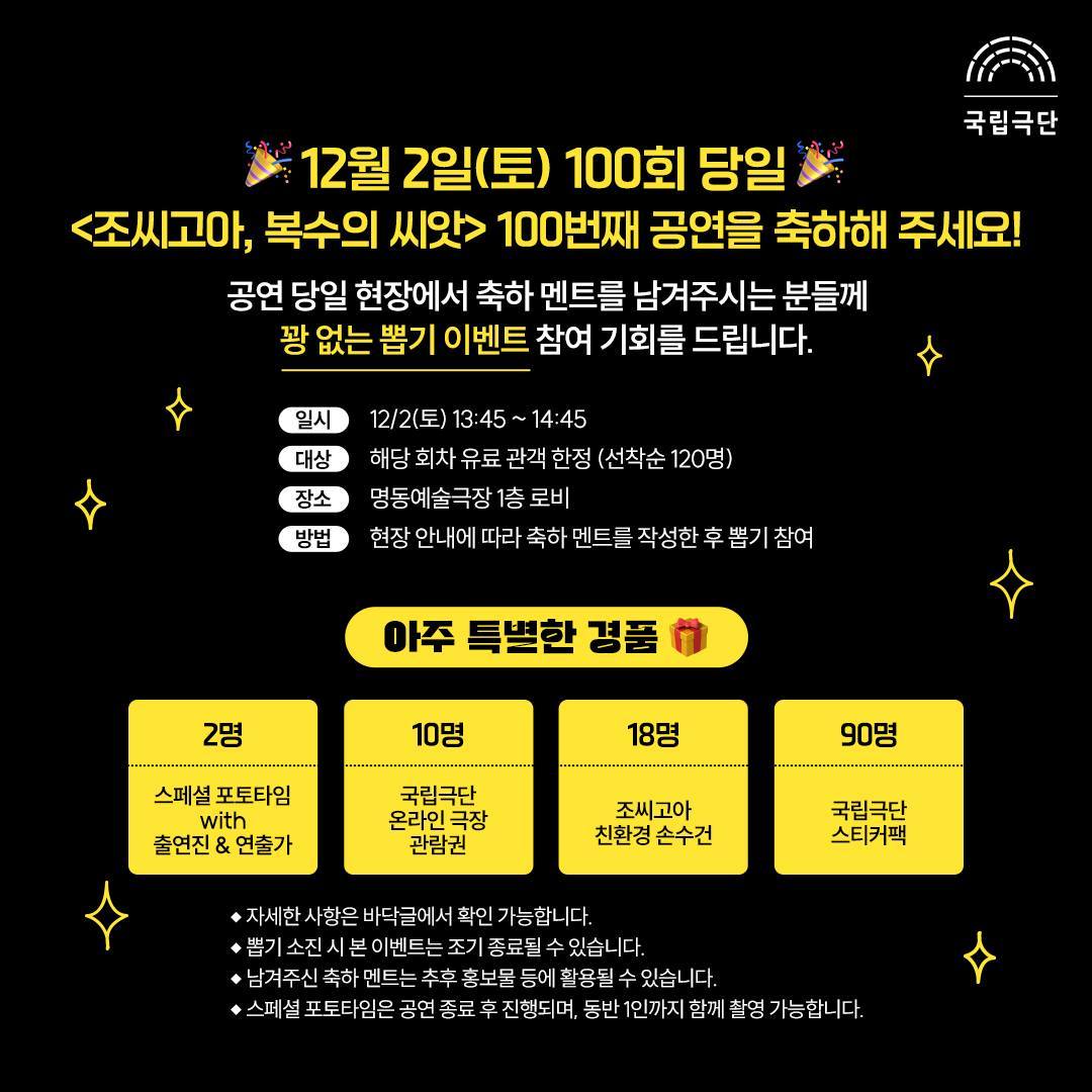 연극은 시대를 비추는 거울이다. 그러니까 그리스 시대부터 지금까지 하루도 빠짐없이 전 세계 어느 곳이든 거짓말인 걸 뻔히 알면서도 무대와 객석으로 나뉘어 진지하게 연극을 올리는 사람이 있고 보는 사람이 존재하는 것이다. 공연이 끝나고 나가는데 울어서 눈이 벌게진 관객들이 많았다. 그만큼 배우들의 연기가 진심이었고 단출한 무대의 추상성도 비극미를 더해 주는 요인이었다(잘린 팔의 등장은 새로웠다). 복수극이지만 비극과 희극을 오가는 쫀쫀한 연출 덕에 세 시간 가까운 러닝티임이 훌쩍 지나가 버린다. 같이 연극을 본 박재희 선생은 "계속 관람 기회를 놓치다가 드디어 보았다"라고 좋아하면서 "어쩌면 그때 놓치고 지금 보아 더 좋았던 것 같다" 만족감을 나타냈다. 마침 2017년 초연 이후 99번째 공연이었단다. 그러니까 토요일인 오늘이 100번째 공연이다. 이 작품을 강추하고 싶지만 이미 다 매진이니 어쩌랴. 인간사가 대체로 이렇다. 그래도 노력하는 사람은 어떡하든 다 본다. 부디 애써서 이 연극을 보시라. 꼭 지금이 아니라도 나중에 꼭 보시라. 정신에 새로운 세계가 펼쳐지리라.