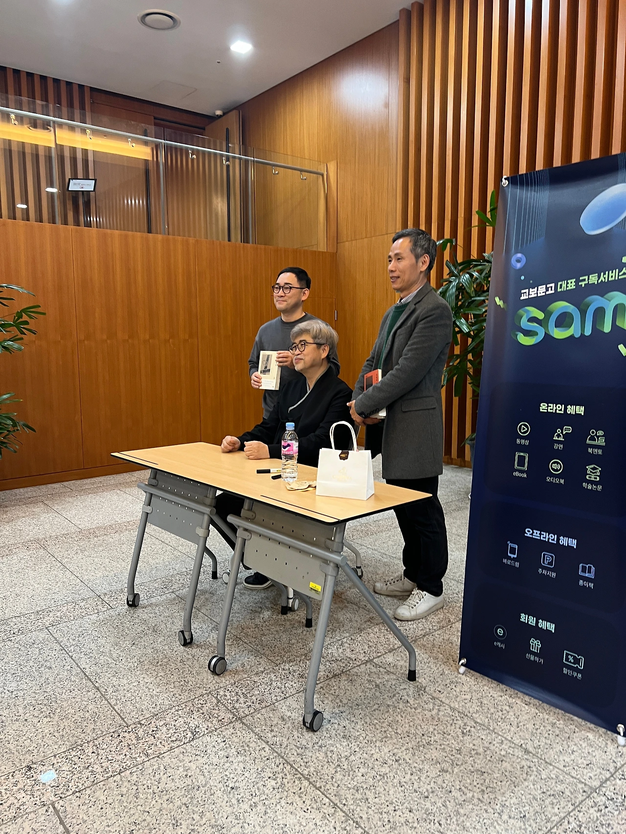 김탁환 작가의 영원한 팬인 윤재호 선생을 몇 년만에 만나 반갑게 인사를 했고 정혜승 작가도 만났다. 내가 아직 새 책을 사지 못했다며 화들짝 놀라는 척을 했더니 관대하게 웃으며 괜찮다고 했다 앞으로 관철동애서 펼쳐질 새로운 프로젝트 이야기에 환호했다. 같이 오신 오희승 저자와도 처음으로 인사를 나누었다. 저자 사인을 받는 동안 나는 사진을 찍었다. 무거워서 책을 가져오지 않아 사인도 받지 않은 나는 김탁한 작가에게 잠깐 2차를 가서 맥주를 마시자고 뻔뻔하게 제안했다.