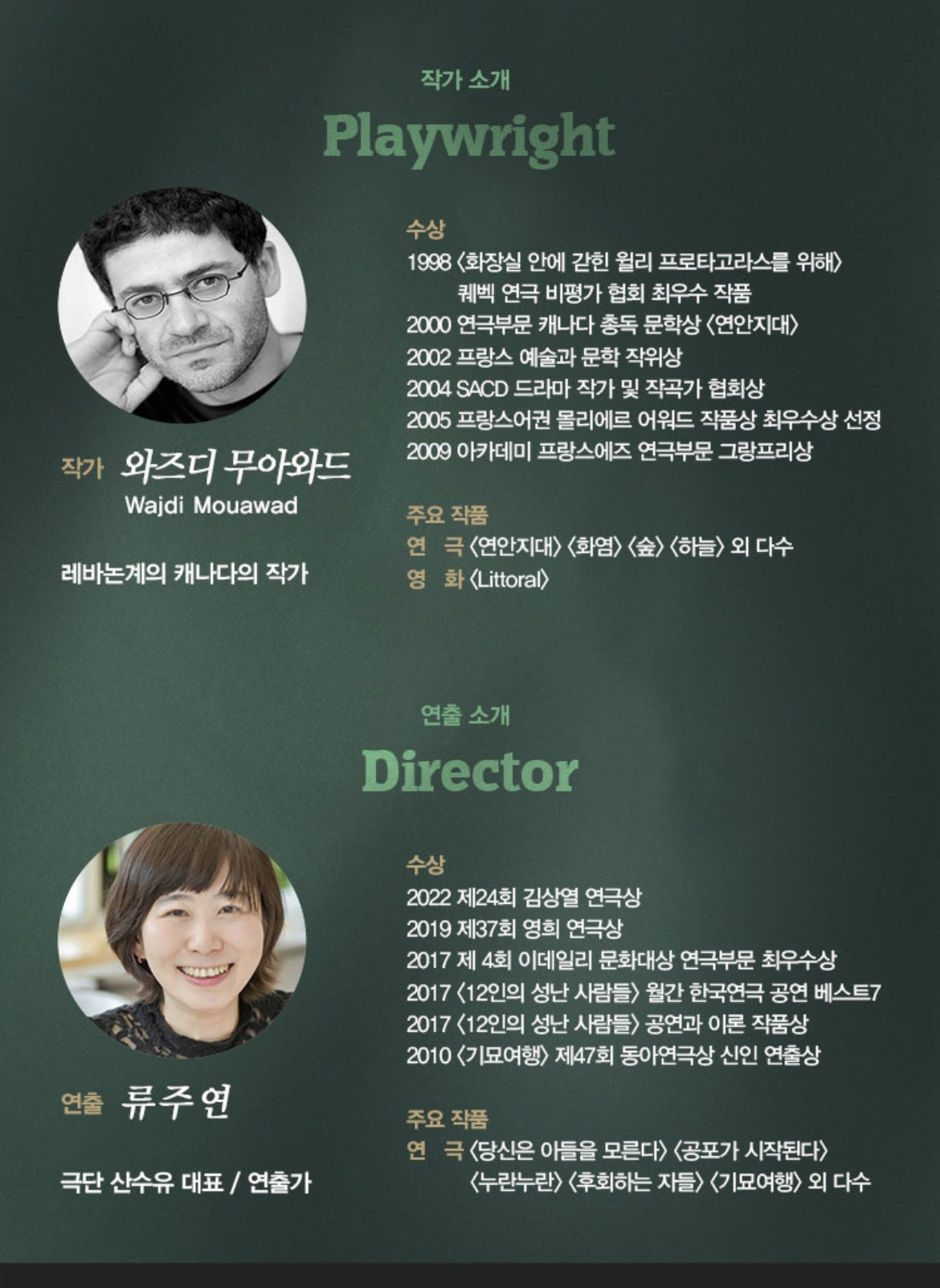 연극은 죽음을 앞둔 엄마의 뇌 속에서 발견된 뼛조각에 의문을 품은 열여섯 살 소녀 루와 150년 전 프랑스와 독일의 전쟁을 모티브로 숲에 들어가 동물원을 만들고 운영하며 살게 된 어느 집안 이야기가 맞물리면서 진행되는데 여기엔 가부장제와 혼외정사, 근친상간, 가스라이팅, 강간, 자살 등 온갖 악덕과 비극의 요소들이 끝도 없이 등장한다. 신기한 건 이야기가 진행될수록 더 세진다는 것이었다. 뇌 속의 뼈, 부서진 턱뼈와 함께 누군가의 등에 새겨진 글귀 '너를 절대 버려두지 않을 거야' 같은 글귀의 아이디어도 절묘했다. 연극을 보면서 이는 조너선 샤프란 포어의 소설 『모든 것이 밝혀졌다』를 읽을 때의 충격과 맞먹는다고 생각했다. 레바논 출신의 퀘벡 연극인 와즈디 무아아드의 야심이 얼마나 큰지 알려주는 증거다. 이 연극은 2006년 무대에 처음 올라갔으며 프랑스와 스페인 등 유럽지역과 영미권 국가에서 크게 흥행했다고 한다. 우리나라에서는 이번이 초연이다.