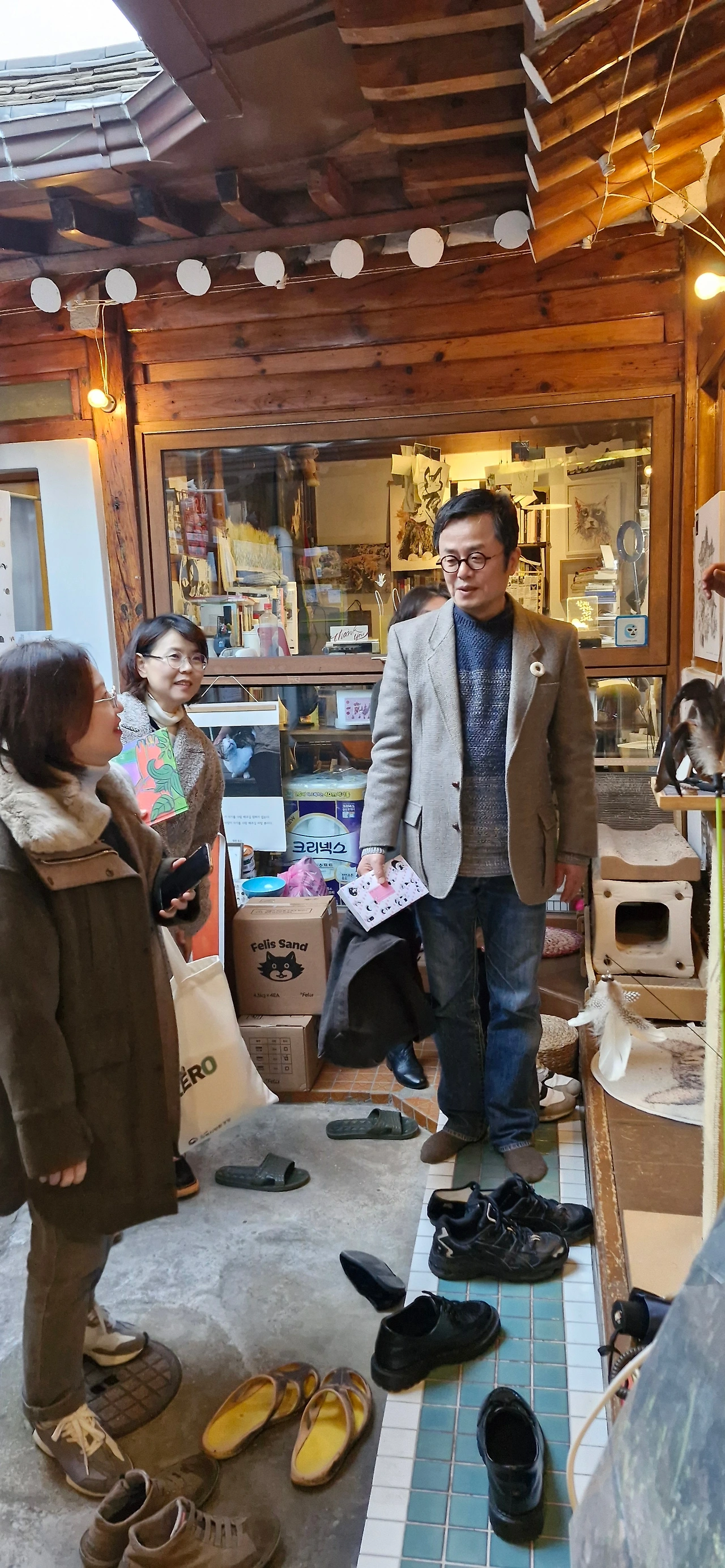 아내 윤혜자가 잠깐 우리 집에 가서 차를 한 잔 하자고 해서 김성신·강경희 커플과 김혜선 작가, 강종희 선생까지 성북동 소행성으로 갔습니다. 아, 가기 전에 고양이 책방 '책보냥'에 가보자고 해서 다들 책방으로 가 김대영 작가와 인사를 나누고 책과 굿즈를 샀습니다. 윤혜자가 이런저런 책을 추천했는데 감격스러운 건 김성신 평론가가 제 책 『부부가 둘 다 놀고 있습니다』를 사서 김혜선 작가에게 선물한 것이었습니다. 저는 거기에 '바보 같이 살아도 큰일 안 나더라고요. 책 나오면 사서 보겠습니다'라고 싸인을 해드렸습니다. 윤혜자가 고양이가 그려진 양말을 사서 한 켤레씩 돌렸더니 다들 기뻐하셨고요.