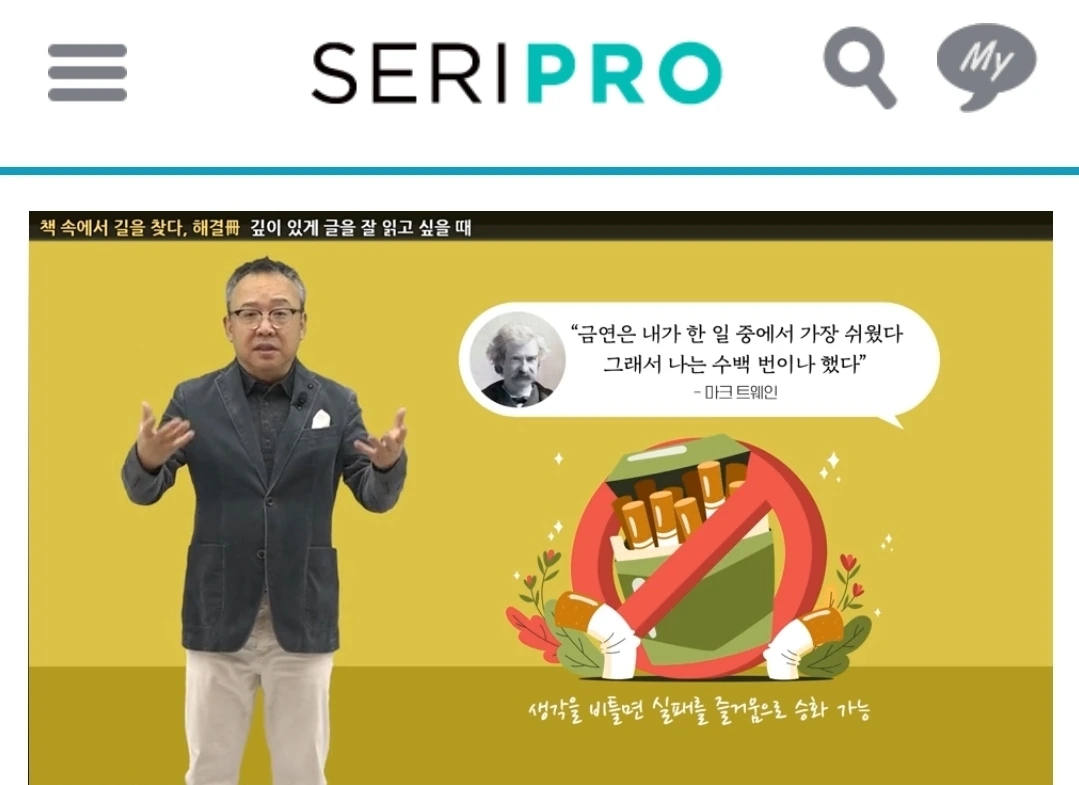 프로직장인을 위한 스마트 연수원 ‘SERIPro ’에서 김성신 선생이 ‘해결책(冊)’이라는 강연을 하는데요, 지난 1월 2일엔 제 책 『살짝 웃기는 글이 잘 쓴 글입니다』를 소개해 주셨습니다.