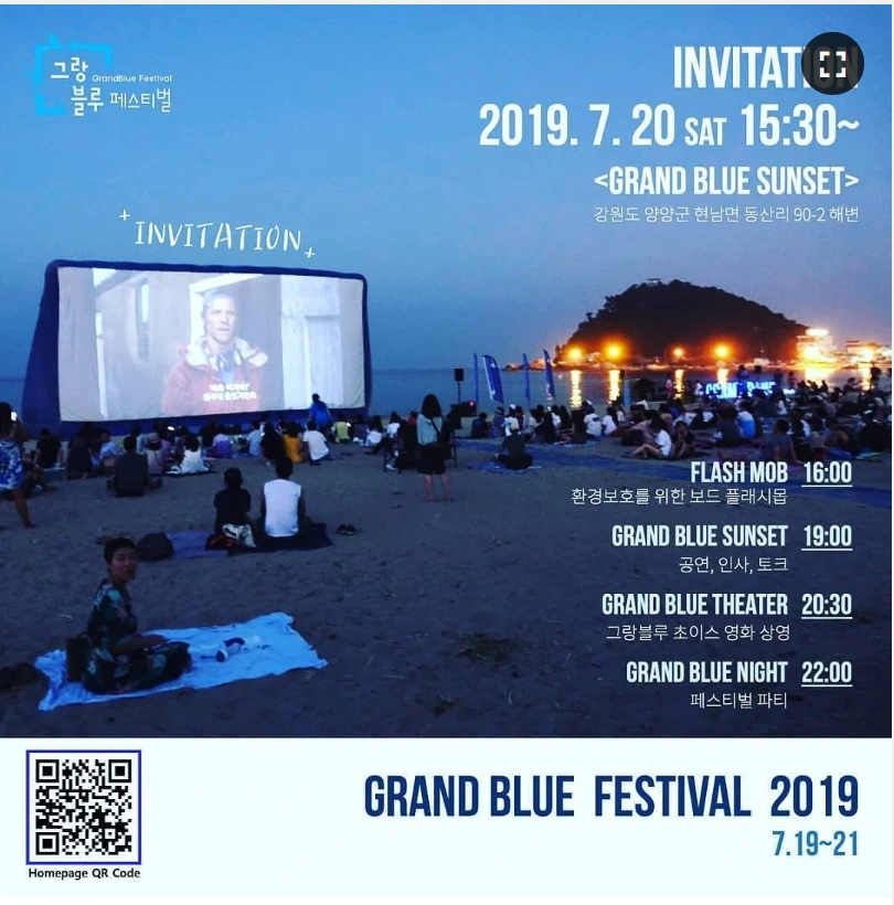 [시네마 천국]이라는 영화에서 마을회관 벽에 스크린이 쏘아 올려질 때 자기도 모르게 탄성을 지르던 기억이 있으실 겁니다. 마을회관 벽이 아니라 바닷가 스크린에서 만나는 영화 또한 그 감동이 남다를 것이라 믿습니다. 이번 여름휴가엔 양양에서 열리는 영화 페스티벌에 가서 잊을 수 없는 추억 하나 만들어 보시는 건 어떨까요. 그랑블루 페스티벌 2019 - 7월 19일부터 21일까지 단 사흘간 열립니다.