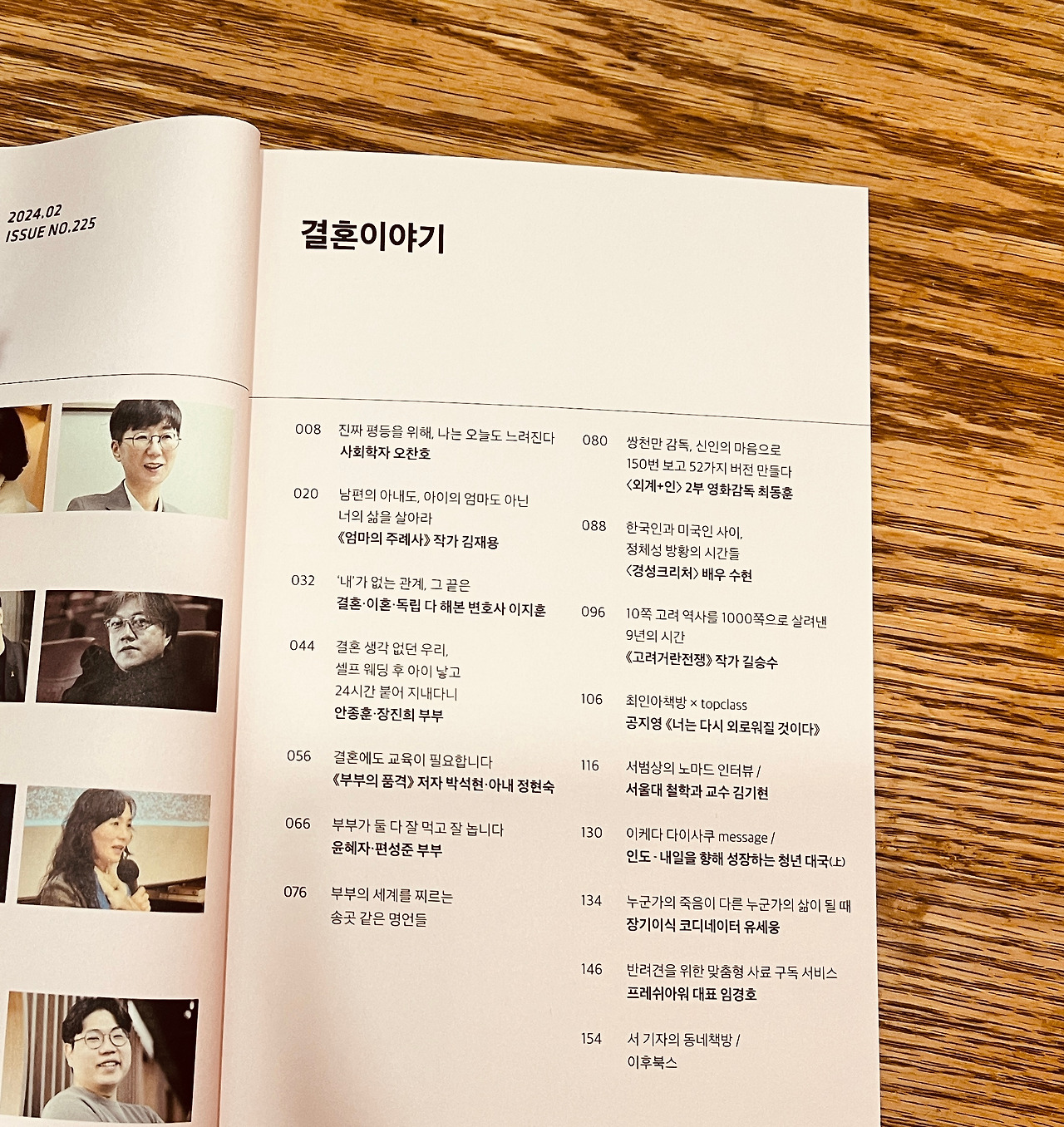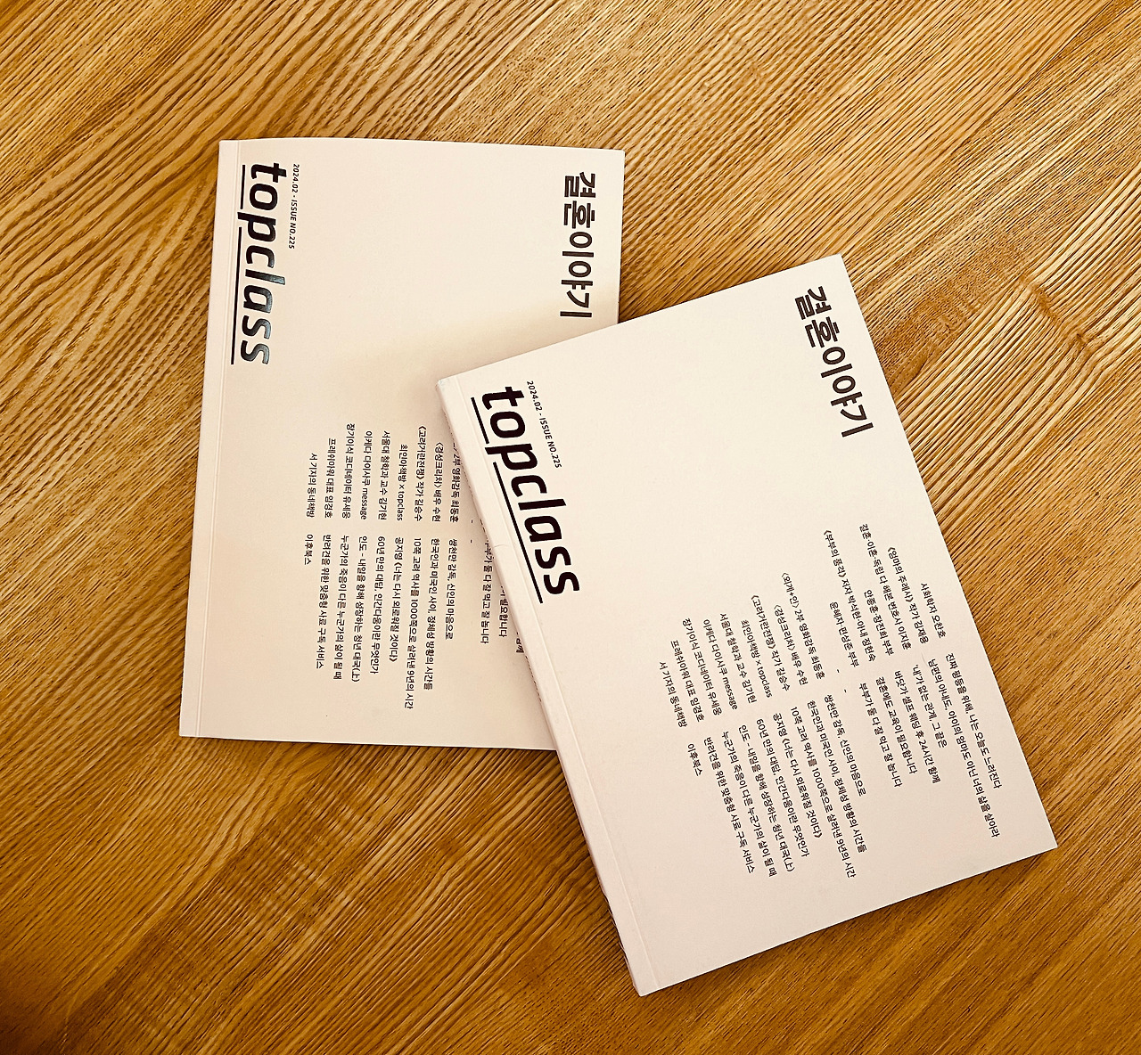 인터뷰 매거진 《topclass》의 이번 달 특집은 '결혼 이야기'인데 저와 윤혜자 두 사람은 <부부가 둘 다 잘 먹고 잘 놉니다>라는 타이틀 아래 각자의 에세이를 한 편씩 실었습니다. 저는 '아내는 왜 두 번이나 모험을 했을까'에 대해 썼고 윤혜자는 결혼이란 '중앙선이 없는 도로에서의 쌍방통행과 같다'는 얘기를 썼습니다. 톱클래스에 썼으니 저희도 덩달아 톱클래스가 된 망상에 빠집니다. 두 사람에게 원고 청탁을 해주신 김민희 편집장님, 감사드립니다.