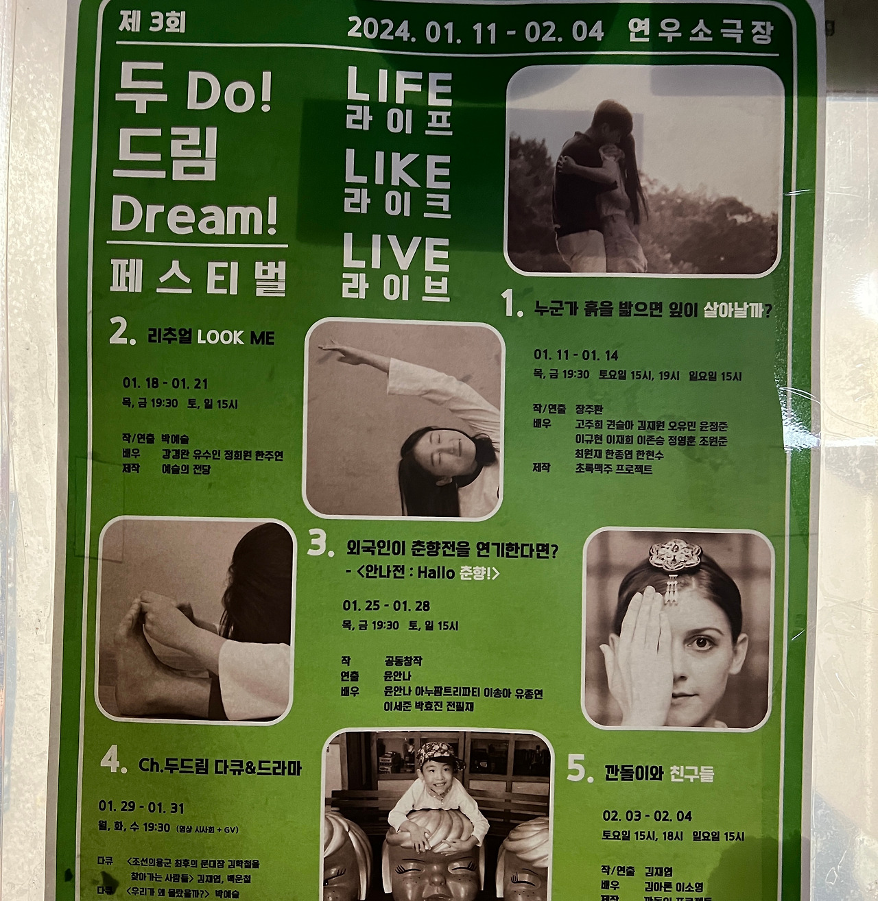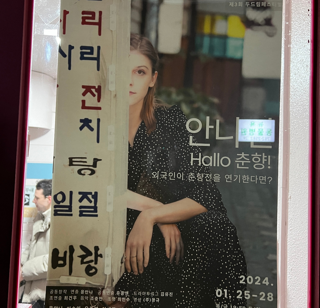 극단 드림플레이의 제 3회 두드림 페스티벌 출품작이라 1월 25일부터 28일까지 나흘밖에 안 하는 연극입니다. 출연 배우가 외국인라 그렇겠지만 이렇게 많은 외국인 관객이 떼로 입장한 공연은 처음 봤습니다. 연극을 이해할 수 있었냐고요? 당연하죠. 이 배우들 다 한국말 잘합니다. 한국에서 연극한 지 십 년 넘는 배우들이 대부분인데요. 한 남자 배우는 <오징어 게임>에서 외국인 노동자로 나오던 그분입니다.