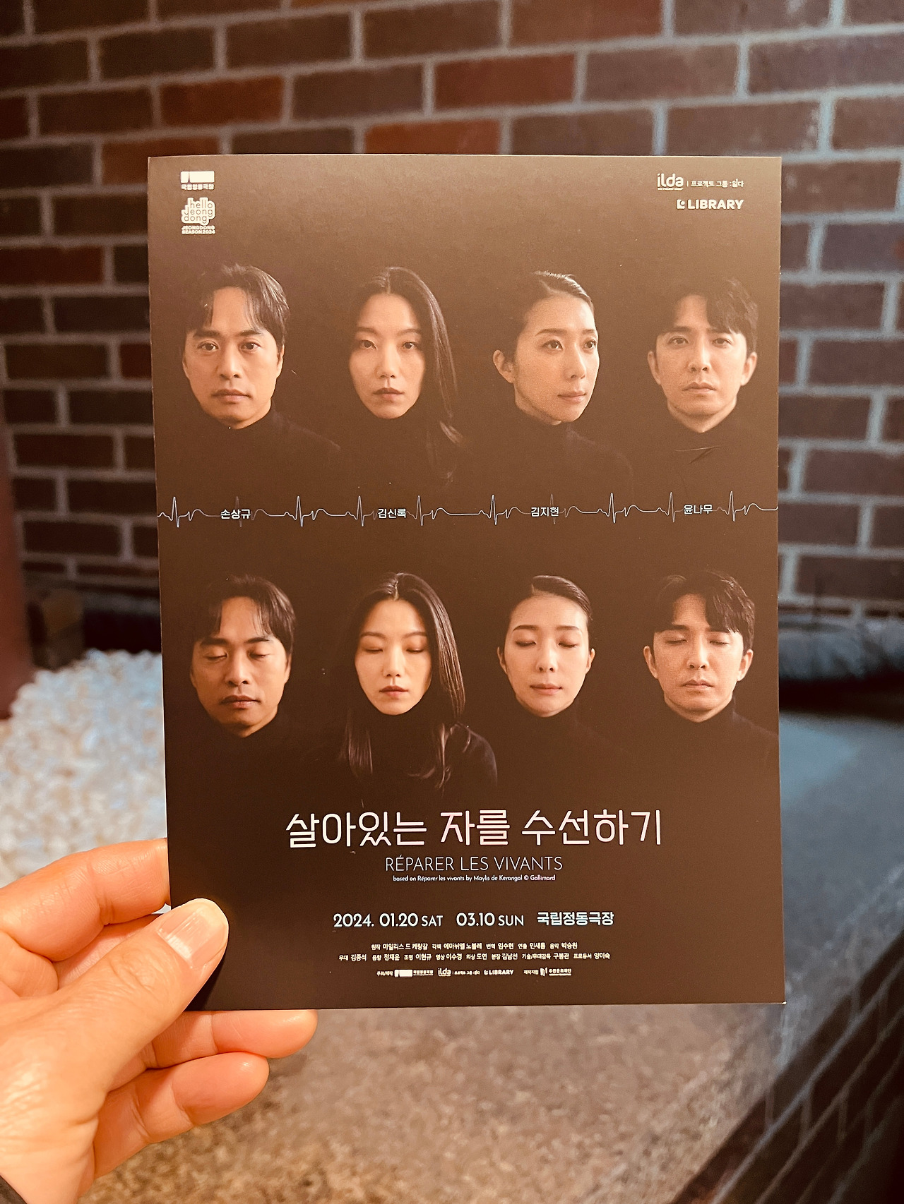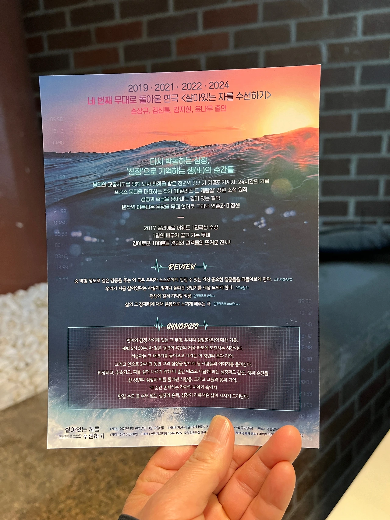 두근거리는 심장 소리, 파도 소리 등 연극의 사운드 디자인과 동영상 활용도 좋았고 절도 있는 수술 장면의 핀 조명 활용 역시 절묘했다. 100분 연극이라고 했는데 두 시간 가까이했던 것 같다. 아마 김신록 배우의 리듬에 맞추어서 그랬을 것이다. 연극 보기 전 로비에서 국회도서관 임지원 대리님을 우연히 만나 인사를 했다. 나는 임 대리님 초청으로 국회도서관에 가서 글쓰기 강연을 한 인연이 있다. 우리가 다음 주 손상규 배우 편도 예매를 했다고 자랑을 했더니 임 대리님도 솔깃하는 표정이었다. 연극이 끝나고 금지된 사진 촬영을 기어이 시도하는 관객들이 눈살을 찌푸리게 했다. 뛰어 온 직원에 의해 제지당했다. 되게 열심히 하는 직원이었다. 아내가 예매를 서둘렀는데도 좌석이 너무 뒤라 배우의 표정을 볼 수 없었다는 게 아쉬웠다(우리 집 연극 티켓은 모두 아내가 산다. 돈도 아내가 다 낸다). 김신록의 미친 연기에 관객들은 만석으로 화답했다.