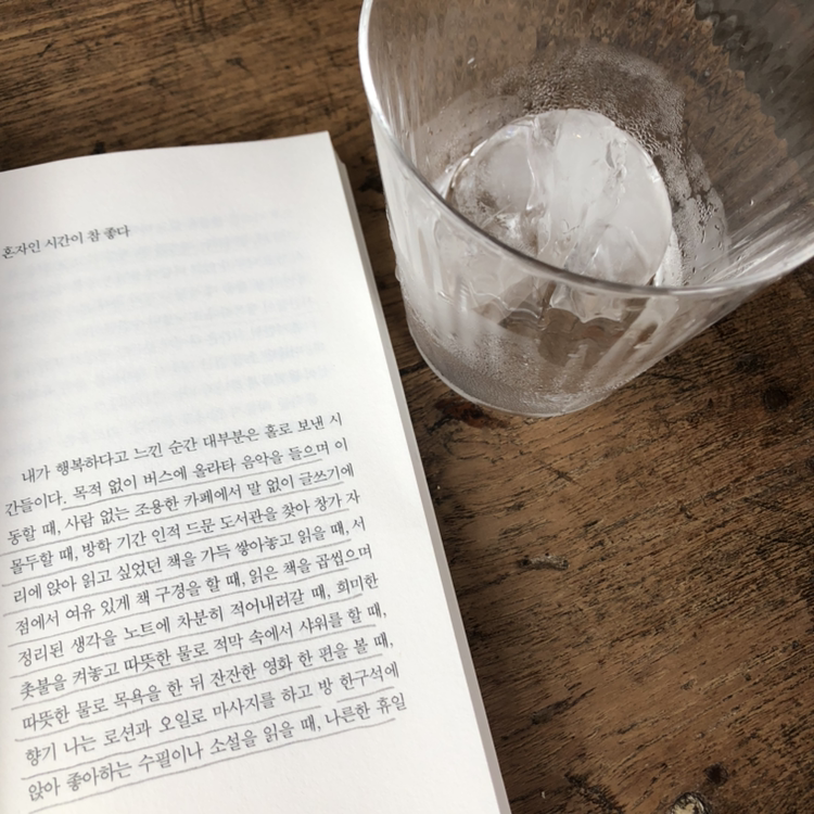 내가 행복하다고 느낀 순간 대부분은...목적 없이 버스에 올라타 음악을 들으며 이동할 때, 사람 없는 조용한 카페에서 말없이 글쓰기에 몰두할 때, 방학 기간 인적 드문 도서관을 찾아 창가 자리에 앉아 읽고 싶었던 책을 가득 쌓아놓고 읽을 때, 서점에서 여유 있게 책 구경을 할 때, 읽은 책을 곱씹으며 정리된 생각을 노트에 차분히 적어 내려 갈 때, 희미한 촛불을 켜놓고 따뜻한 물로 적막 속에서 샤워를 할 때...