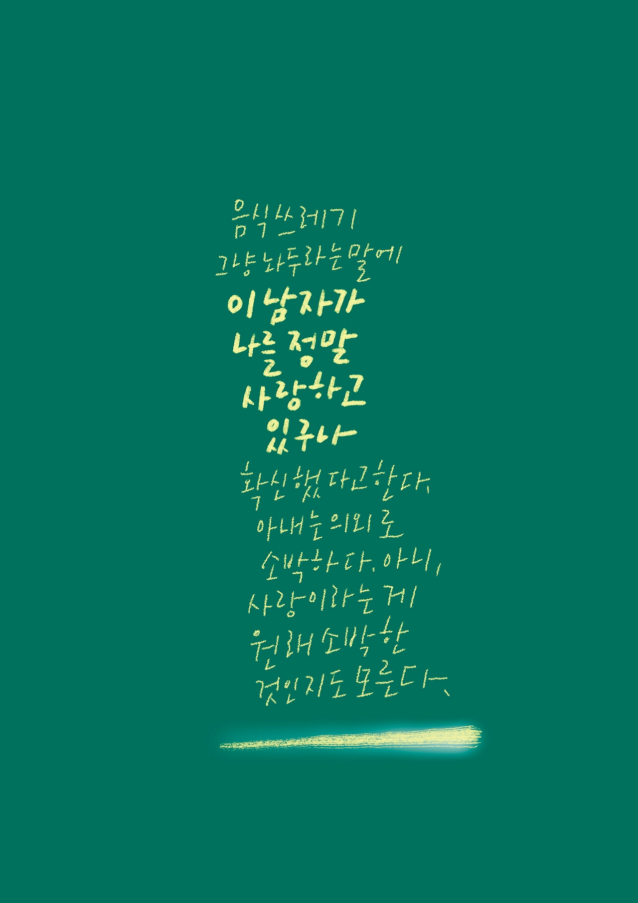 며칠 전 아내가 설거지를 하고 있길래 "음식쓰레기 그냥 놔둬. 내가 치울게."라고 말한 적이 있다. 비위가 약한 아내가 음식물쓰레기 치우는 걸 힘들어한다는 걸 알고 있기 때문이다. 그런데 그날 저녁 아내가 그 얘길 다시 꺼냈다. 내가 음식물 쓰레기 그냥 놔두라는 말을 하는 순간 '아, 이 남자가 나를 정말 사랑하고 있구나'라고 확신했다는 것이다. 나는 아내에게 확신을 주는 게 이렇게 쉽다니, 하며 감탄했다. 아내는 의외로 소박한 여자였다. 아니, 사랑이라는 게 원래 소박한 것인지도 모른다. 큰 사랑이란 없는 것인지도 모른다는 생각을 했다. 사랑은 다 작다. 작은 사랑들이 모여 인생을 따뜻하게 만드는 것이다.