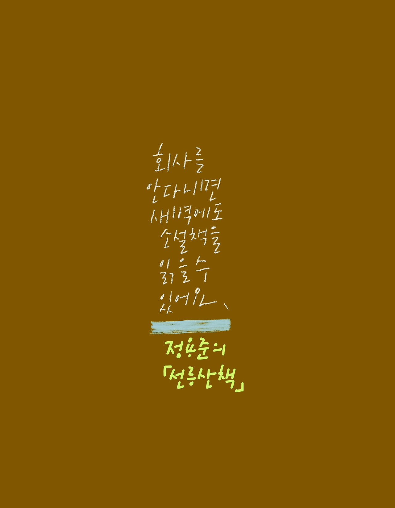 일요일 새벽에 갑자기 눈이 떠졌다. 전날 너무 일찍 잤던 것이다. 한 다섯 시 반쯤 되지 않았을까 생각했는데 웬걸, 세 시 반이었다. 회사를 다닐 때라면 그저 화장실에 가서 소변이나 보고 다시 침대로 기어 들어갔겠지만 이젠 아침에 출근할 필요가 없으니 바로 들어가지 않아도 된다. 마루로 나가 책꽂이를 둘러보다가 정용준의 단편집 『선릉 산책』 을 꺼내 펼쳤다. 예전에 샀는데 그때 심란하고 바쁜 일들이 겹쳐 일어나는 중이었기에 글자가 눈에 들어오지 않았다. 다시 펼쳐 찬찬히 읽어보니 귀엽고 좋다. 역시 새벽에 읽는 책 맛이 최고다. 여러분, 작가가 되면 새벽에 일어나서 소설책 읽을 수 있어요. 네, 안 부러운 거 다 압니다.