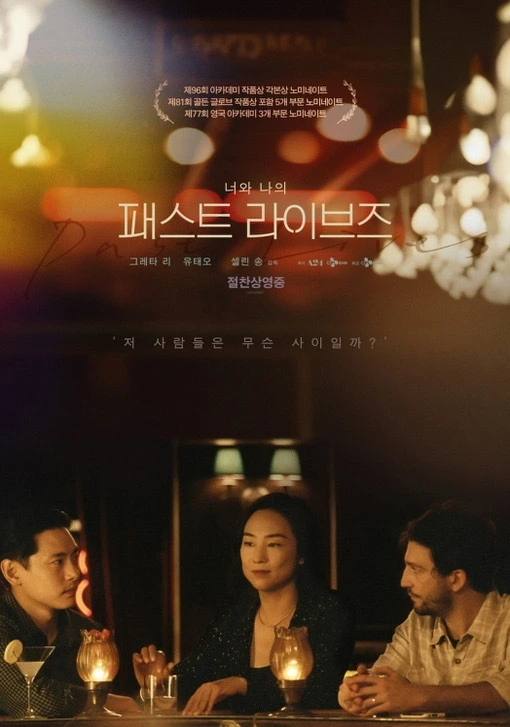 셀린송이 아카데미 수상을 하진 못했지만 작품상과 각본상 후보에 오른 것만으로도 대단한 업적이라고 생각한다(개인적으로는 <미나리>보다 몇 배 더 잘 만든 영화라 생각함). 영화 도입부의 빌드업은 좀 지루했지만 캐나다 여행 출국 심사대의 몇 마디 대사로 나영과 아서(존 마가로)가 부부임을 나타내는 장면도 재치 있었고 '노벨상-풀리처상-토니상' 순으로 해성(유태오)이 나영의 욕망의 좌표를 짐작하는 대사도 재미있었다. 무엇보다 첫 장면 새벽의 바에서 상징적으로 보여 주었던 나영·해성·아서 세 사람의 삼각형에 치졸함이 조금도 들어가지 않은 점이 마음에 들었고 그레타 리나 유태오, 존 마가로의 연기도 고르게 좋았다. 특히 유태오의 매력이 돋보였다.