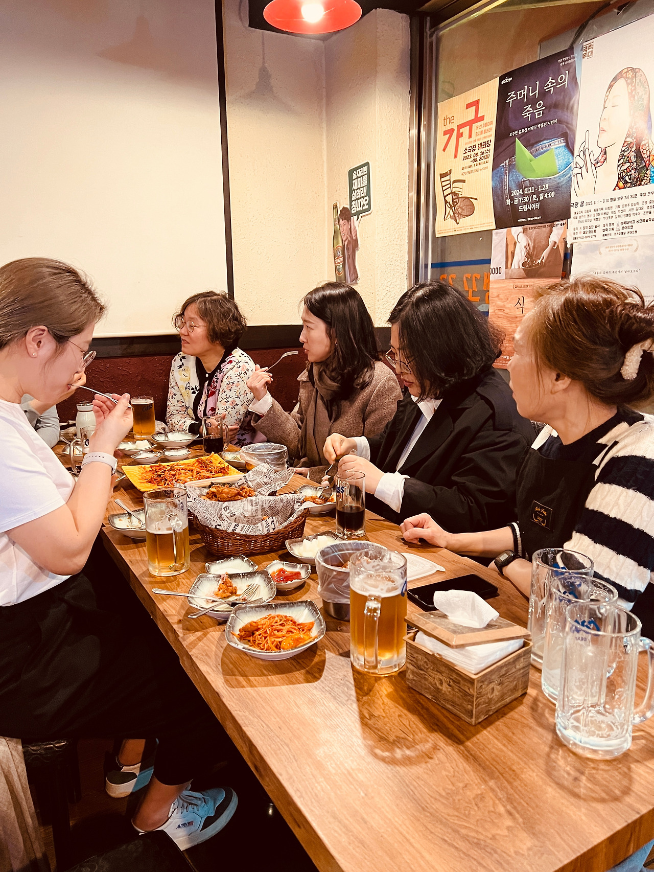 줌이라 몰랐는데 알고 보니 학교 선후배인 분들이 있었습니다. 이게 무슨 인연이냐며 너무 신기해하시더군요. 마지막 날이라 간단히 맥주 한 잔을 하고 헤어지기로 했습니다. 저희 단골이기도 한 한성대입구역 근처 '꼬꼬댁 꼬꼬'로 갔는데 들어가자마자 두 분이 차 시간 때문에 먼저 일어나셨고 맥주 대산 콜라를 마시는 분도 계셔서 꼬꼬댁 사장님이 짜증을 내셨습니다. 저희 예약 때문에 술 많이 마시는 팀이 들어오는 걸 막아 서 돌려보냈다는 것입니다. 말을 그렇게 하지만 그래도 사장님은 정감 있는 분입니다. 우리는 치킨 이 인분과 골뱅이 소면과 함께 생맥주를 마시며 수다를 떨었습니다. 일행 중 누군가 치킨이 정말 맛있다며 "역시 서울이야!"라고 해서 모두 웃었습니다. 우리는 그동안 쓴 글을 모아 작은 책을 만들어 보기로 하고 헤어졌습니다. 일단 원고를 수정, 탈고하고 모아야겠죠. 5주 동안 썼던 글들이 어떻게 완성되어 하나로 묶일지 기대됩니다.