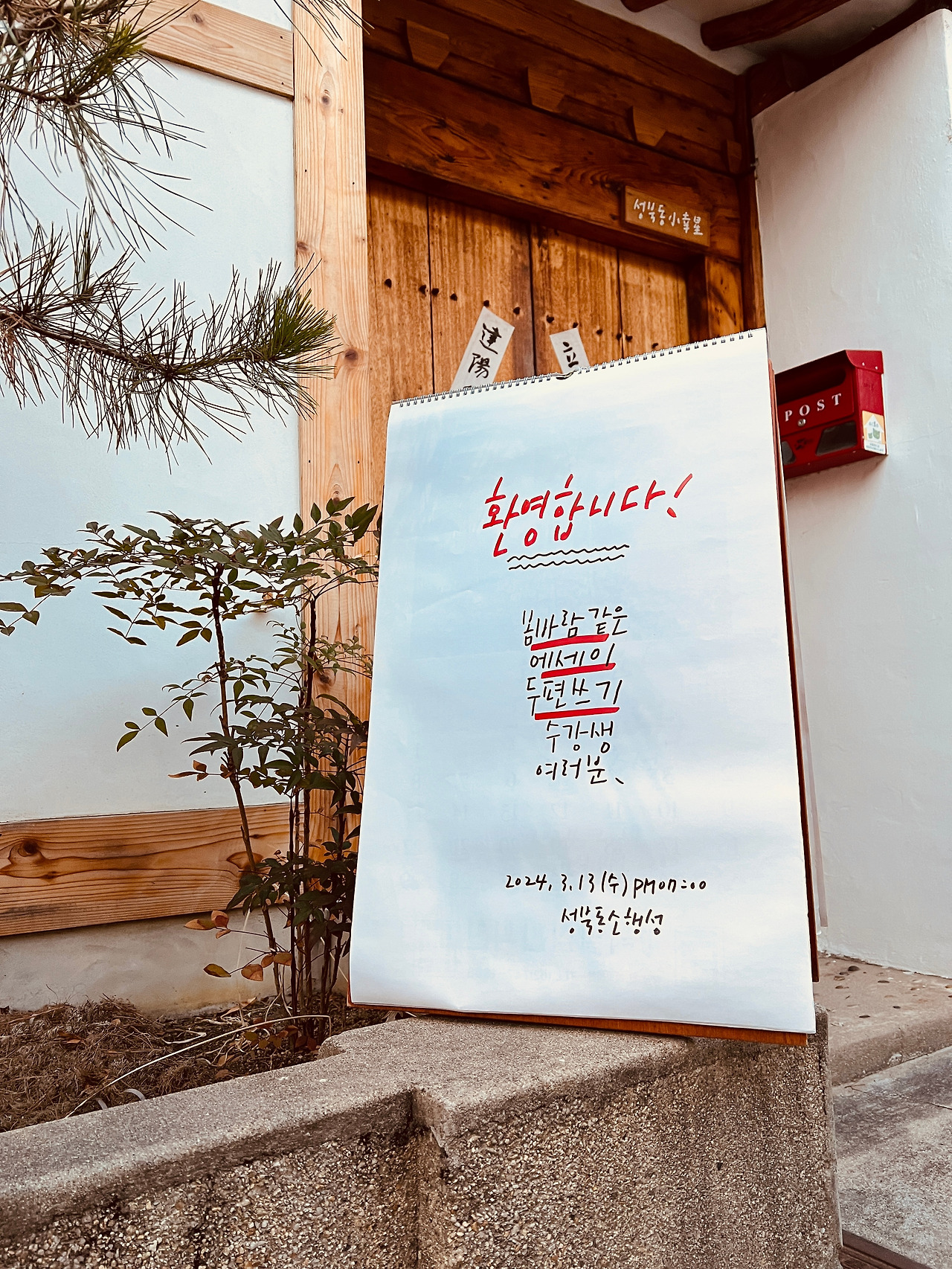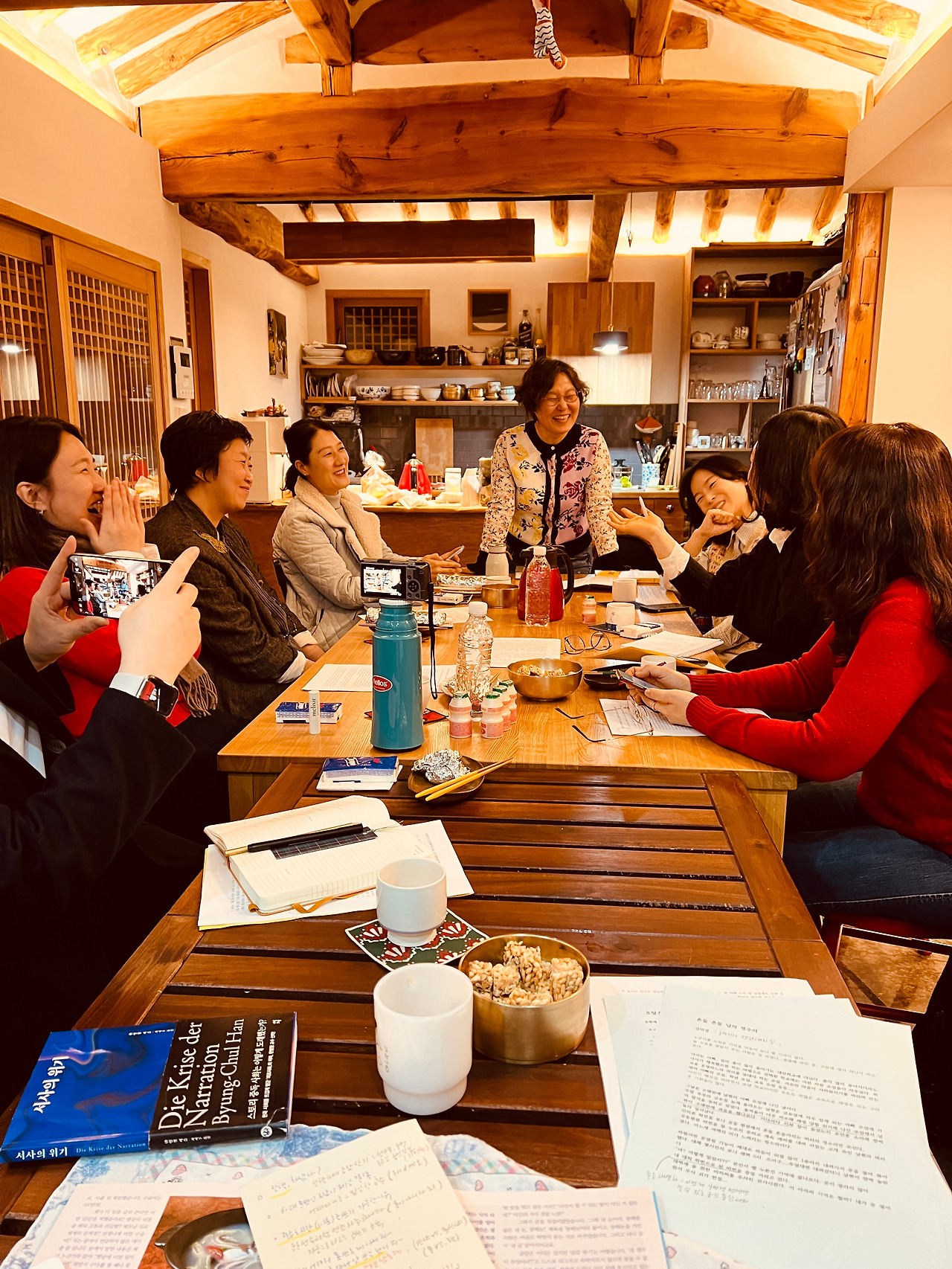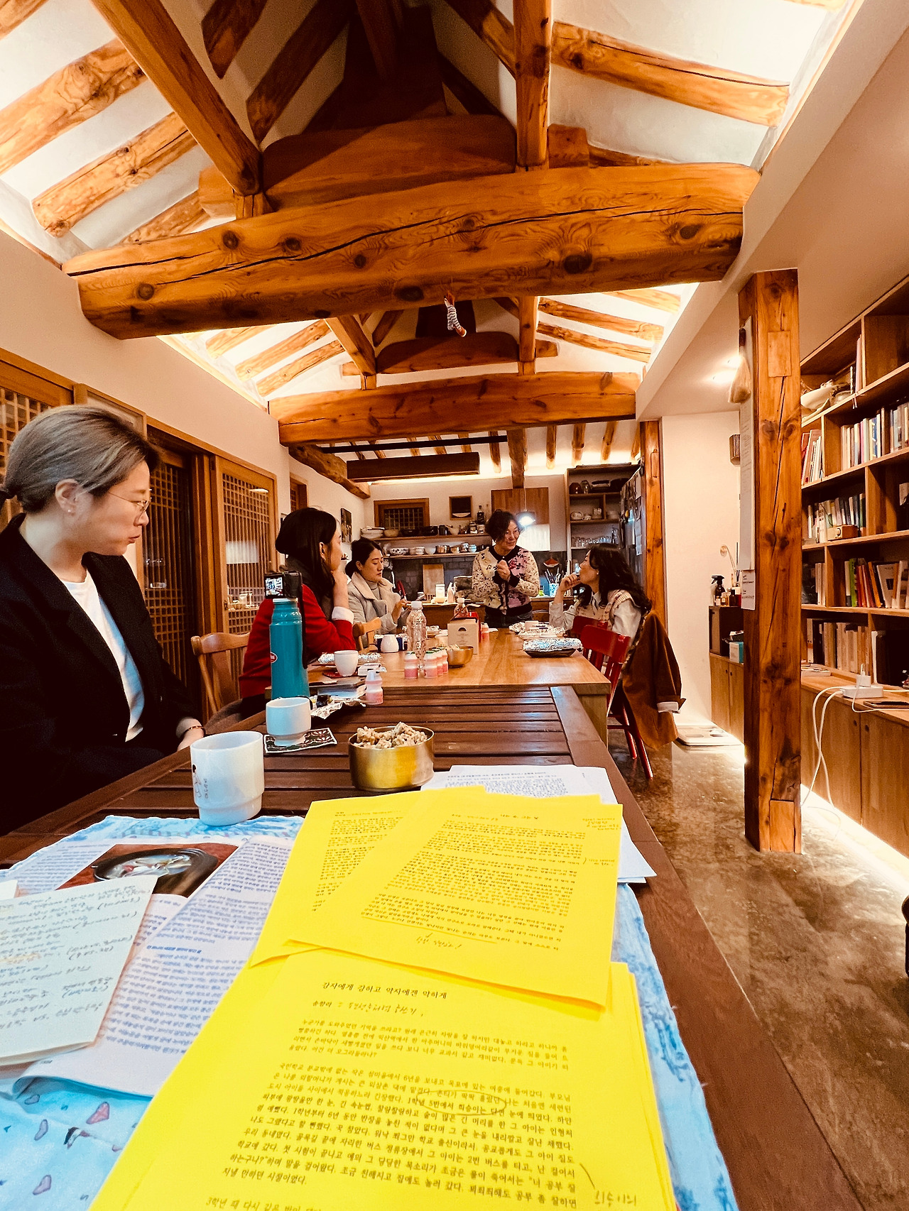마지막 날인 어제는 줌을 벗어나 성북동에 있는 저희 집 '성북동소행성'에서 대면 수업을 했습니다. 전부터 저희 집에 와보고 싶던 분들이라 그런지 마당과 마루, 책꽂이 등을 돌아보며 정말 좋아하시더군요. 저는 미리 준비한 컬러 종이에 써 오신 에세이들을 인쇄해서 메모도 한 뒤 한 분 한 분 소리 내 읽고 나눠드리는 것으로 수업을 대신했습니다. 강의 뒷부분엔 출판기획자 윤혜자 선생의 '책 쓰기에 대한 미니 특강'도 있었습니다. 로마에 계신 선생님과 개인적 사정으로 오지 못하신 선생님이 안타까웠습니다(두 분 다 줌으로도 참석하지 못하는 상황이었습니다).