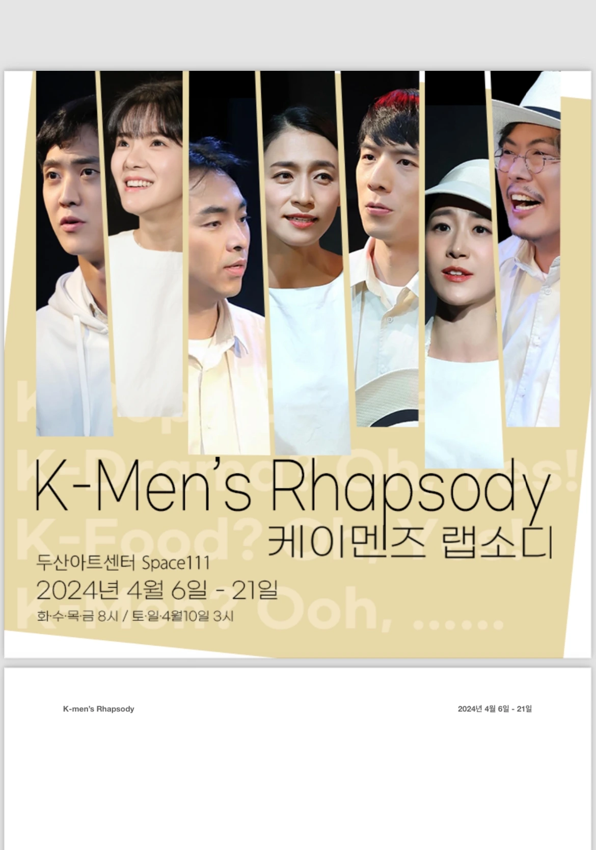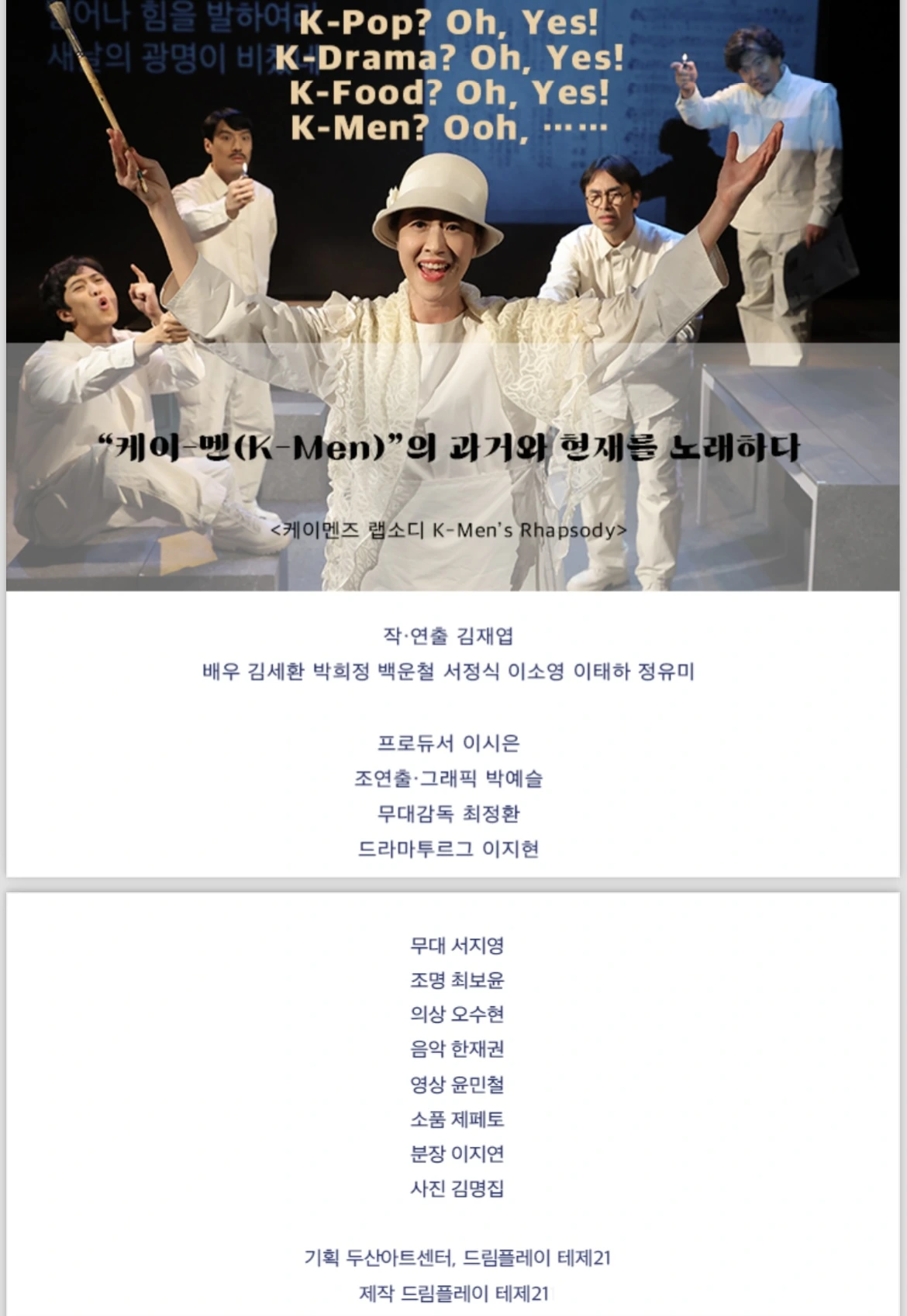 어제 두산아트센터에서 《케이맨즈 랩소디(K-Men’s Rhapsody)》를 보았습니다. '한남의 광시곡'이라는 제목으로 본 것까지 치면 세 번째 보는 겁니다. 저는 왜 이렇게 이 연극을 여러 번 보는 걸까요? 첫째, 재밌기 때문입니다. 명백한 페미니즘 연극인 이 작품은 1920년대 《신여성》이라는 잡지의 편집실에서 시작해 2016년 강남역 사건, 2022년 신당역 사건까지 종횡무진 오가며 모든 남성의 DNA에 박힌 듯한 차별적 시각과 여성 혐오의 증거를 채집해 드라마로 재현하고 해석합니다. 그런데 그 방법이 과장과 뒤틀린 유머와 자기반성적 메타인지("야, 연출 형은 왜 나한테 이런 역을 시키지? 너무하는 거 아냐?" "아무리 연극이라도 이런 대사는 내 입으로 못하겠다.")가 뒤섞여 있어 어렵지 않고 장면장면마다 큰 웃음을 자아냅니다.