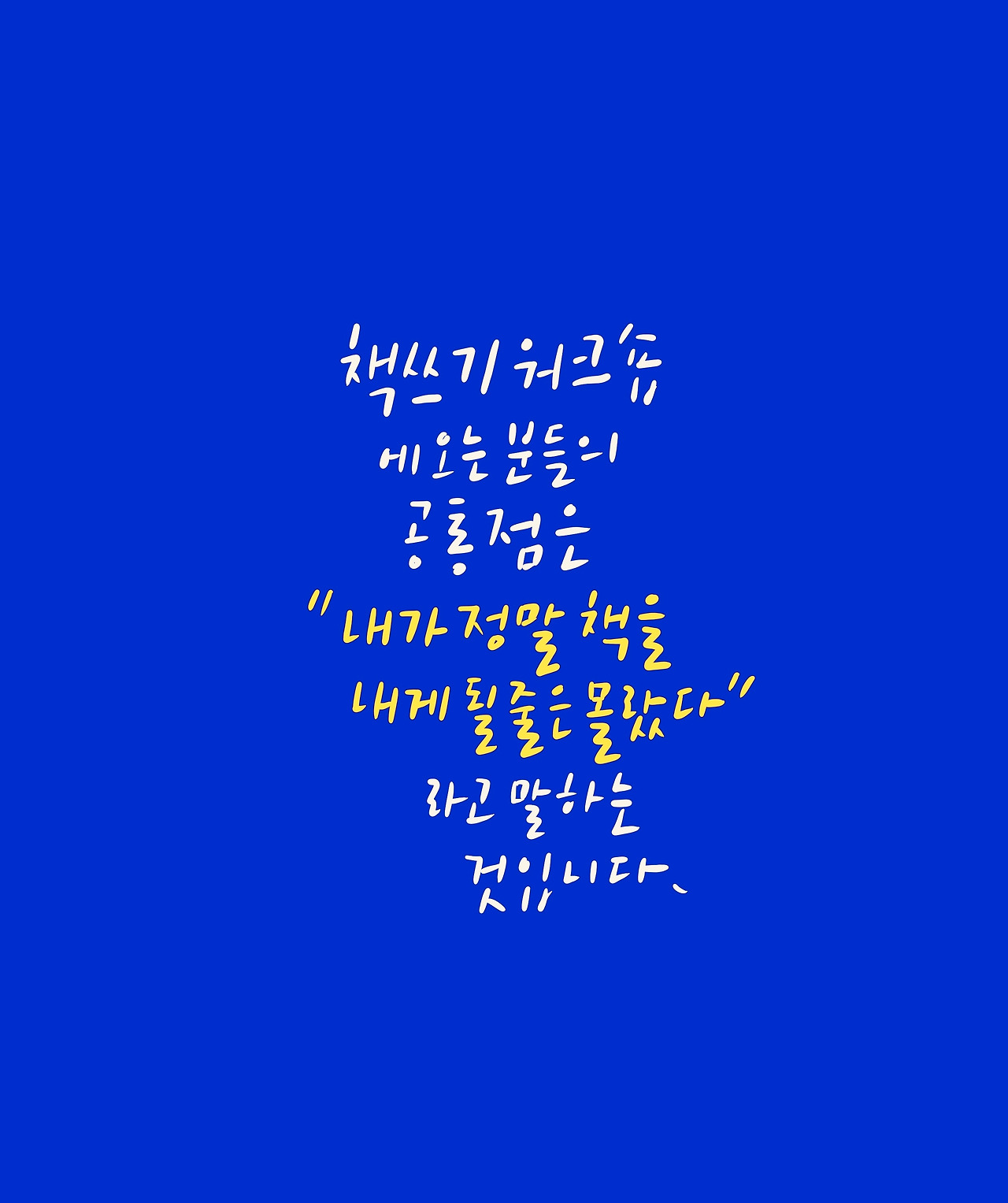 책 쓰기 워크숍에 오는 분들의 공통점은 "내가 정말 책을 내게 될 줄은 몰랐다"라고 말하는 것입니다. 이상하죠. 책을 쓰고 싶어서 온 사람들인데 말이죠. 저는 그 이유가 자기 안에 있는 이야기를 꺼내는 방법을 아직 몰라서라고 생각합니다. 그리고 저희가 잘하는 일이 바로 그것입니다. 그렇게 처음에 의구심을 가지고 오신 분들도 저희에게 와서 의미 있는 책을 냈으니까요.