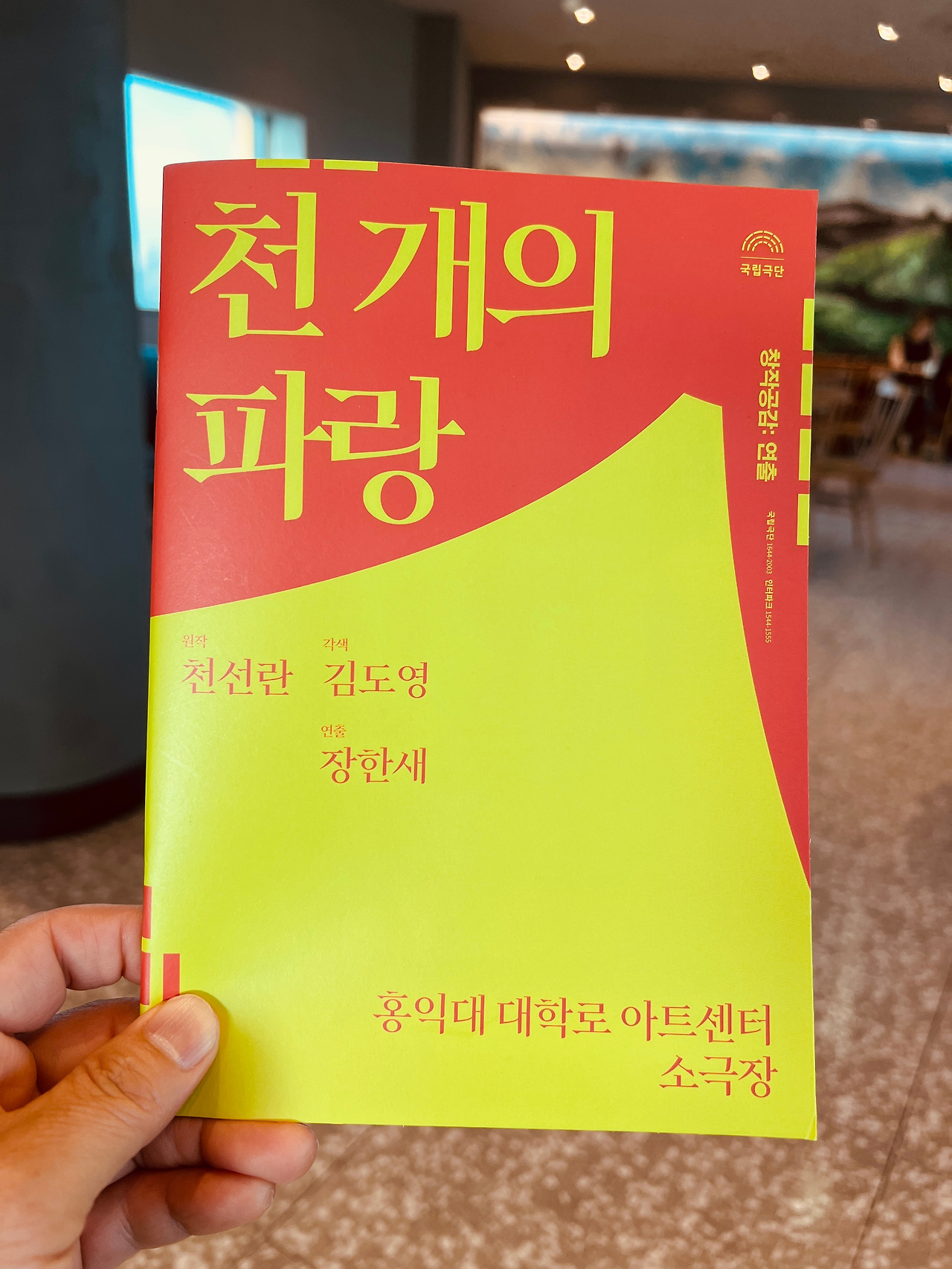 국립극단의 연극 《천 개의 파랑》은 여러 가지로 화제였다. 우선 젊은 소설가 천선란의 베스트셀러라는 점, 그리고 연극과 거의 동시에 국립국악원에서 판소리극으로도 만들어진다는 점이 두 번째였다. 이 정도면 시대정신이라고 해도 좋지 않을까 싶은 '우리는 너무 빨리 달리느라 많은 것을 놓치고 산다'라는 주제의식은 가까운 미래의 '기수 로봇'이 바라보는 인간의 모습이라는 설정 덕분에 설득력을 얻는다.